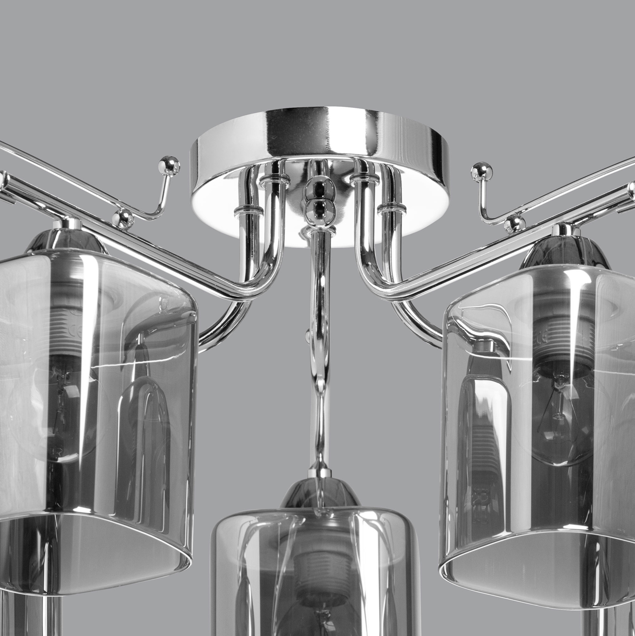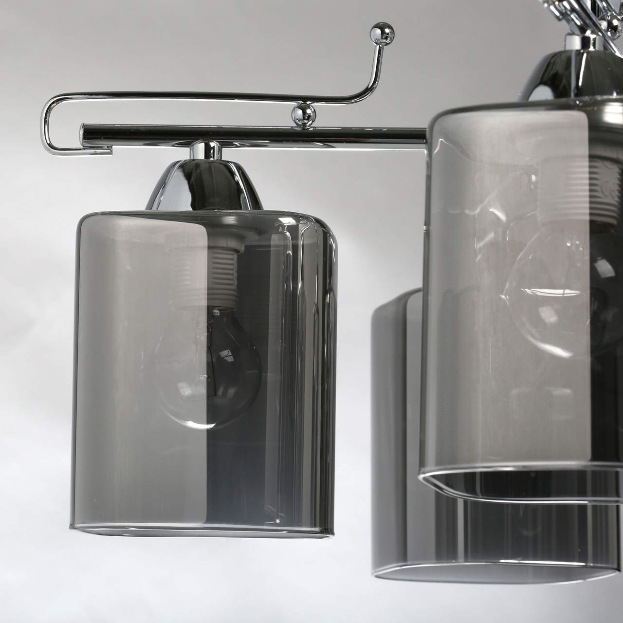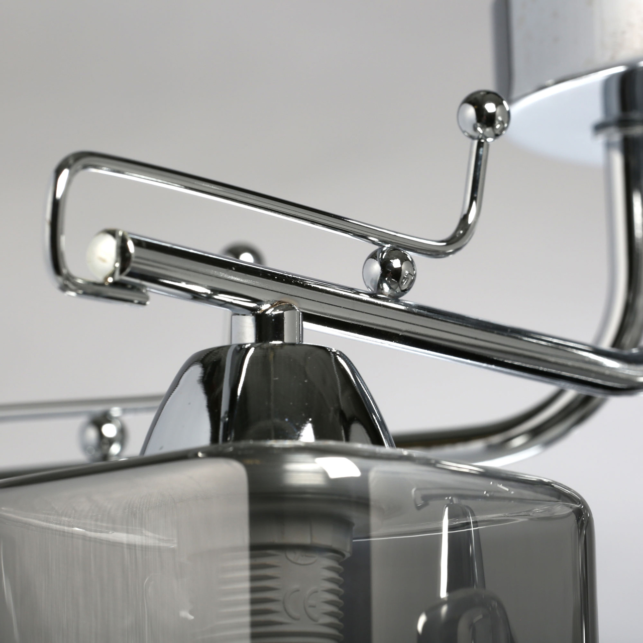 Основание светильника выполнено из металла и гальванизировано в цвет хрома, что придает ему прочность и долговечность. Стеклянные плафоны гальванизированы в дымчатый цвет, что создает мягкий и приятный свет.