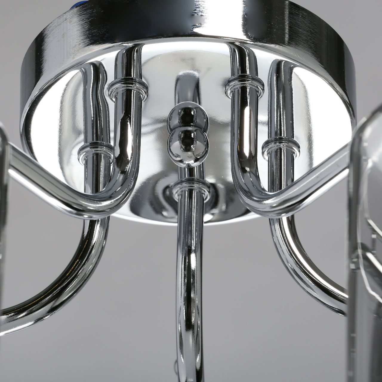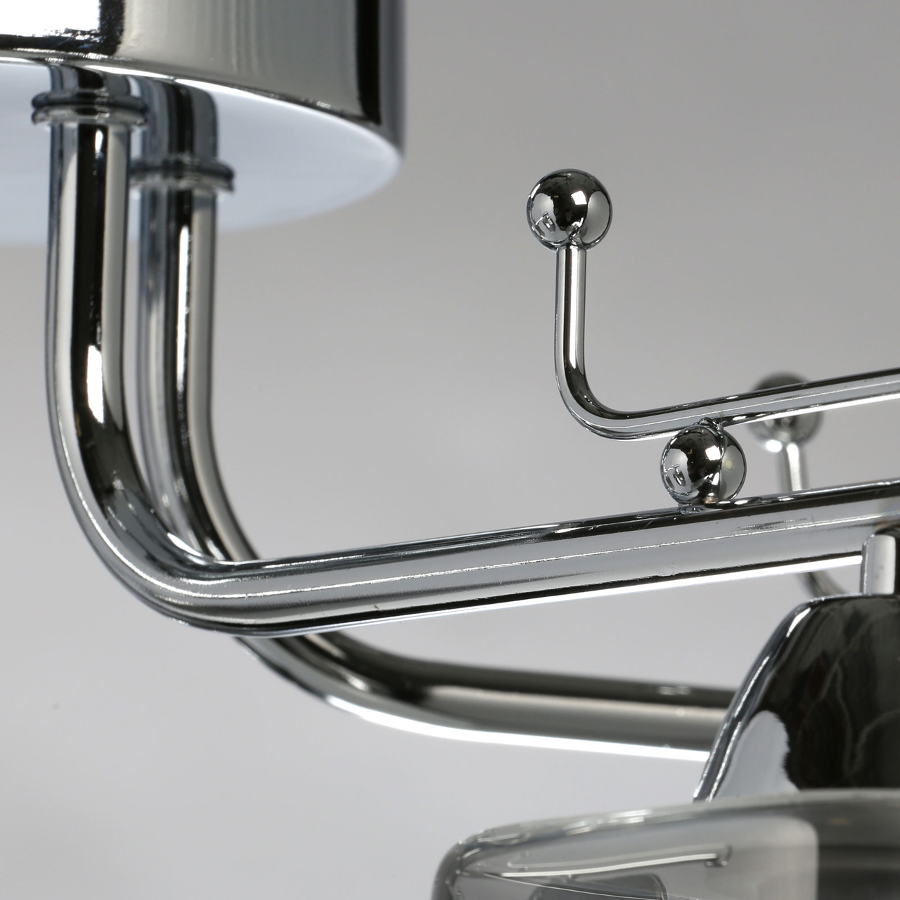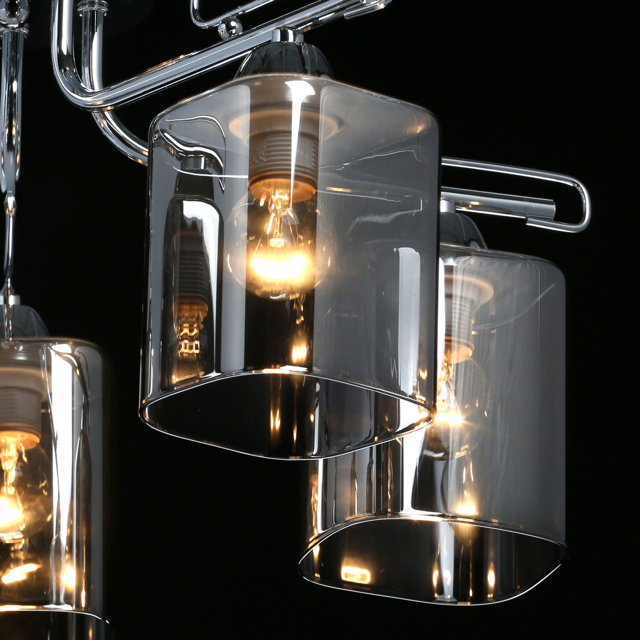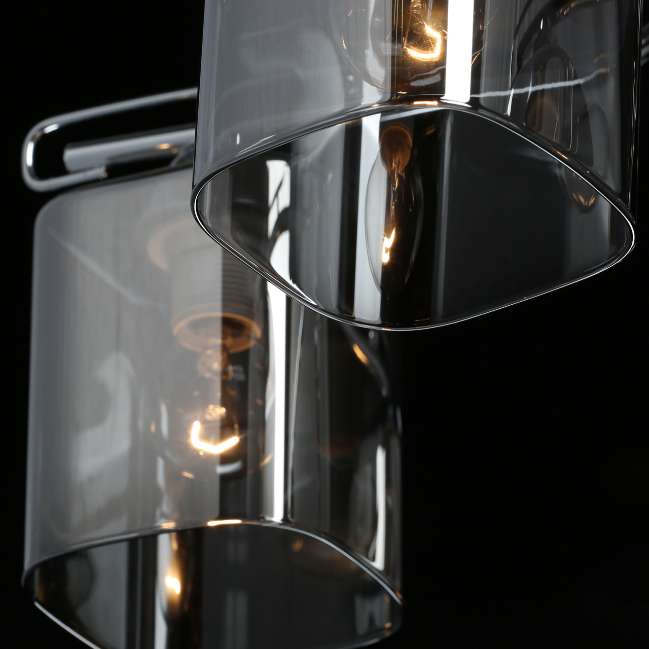 Основание светильника выполнено из металла и гальванизировано в цвет хрома, что придает ему прочность и долговечность. Стеклянные плафоны гальванизированы в дымчатый цвет, что создает мягкий и приятный свет.