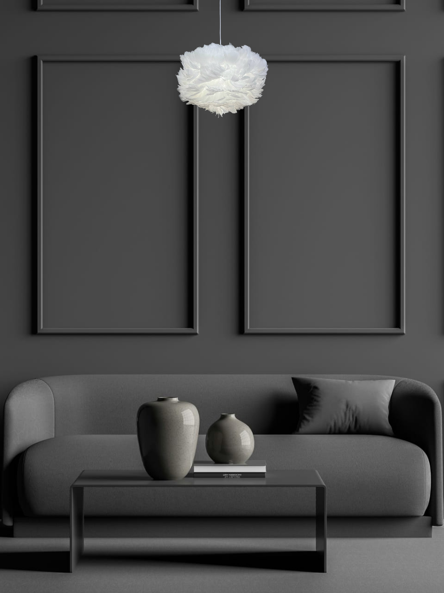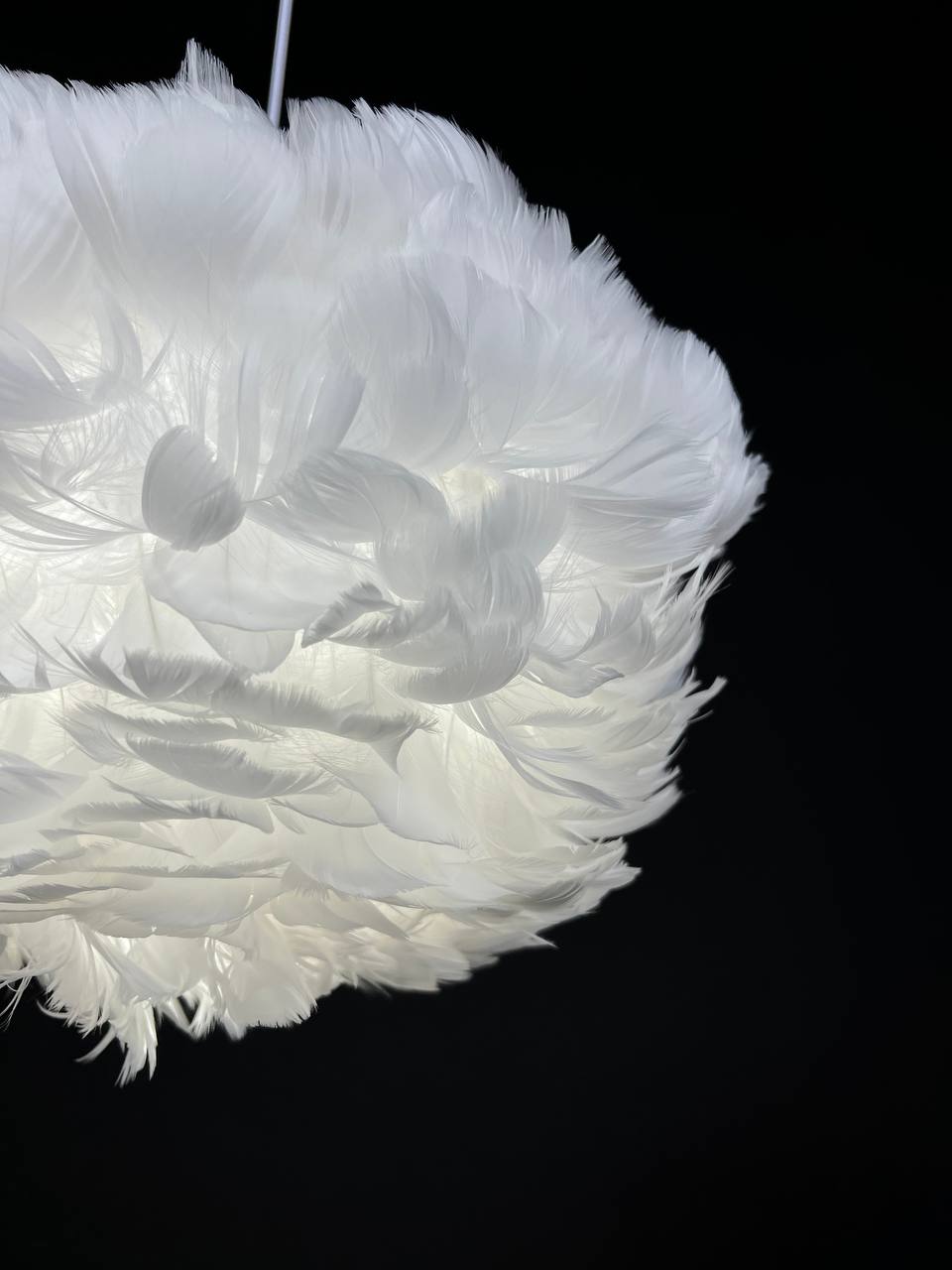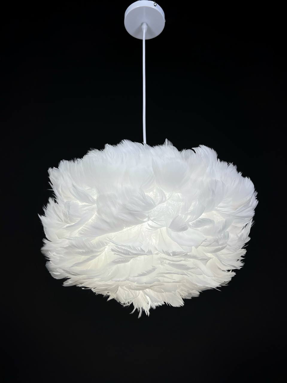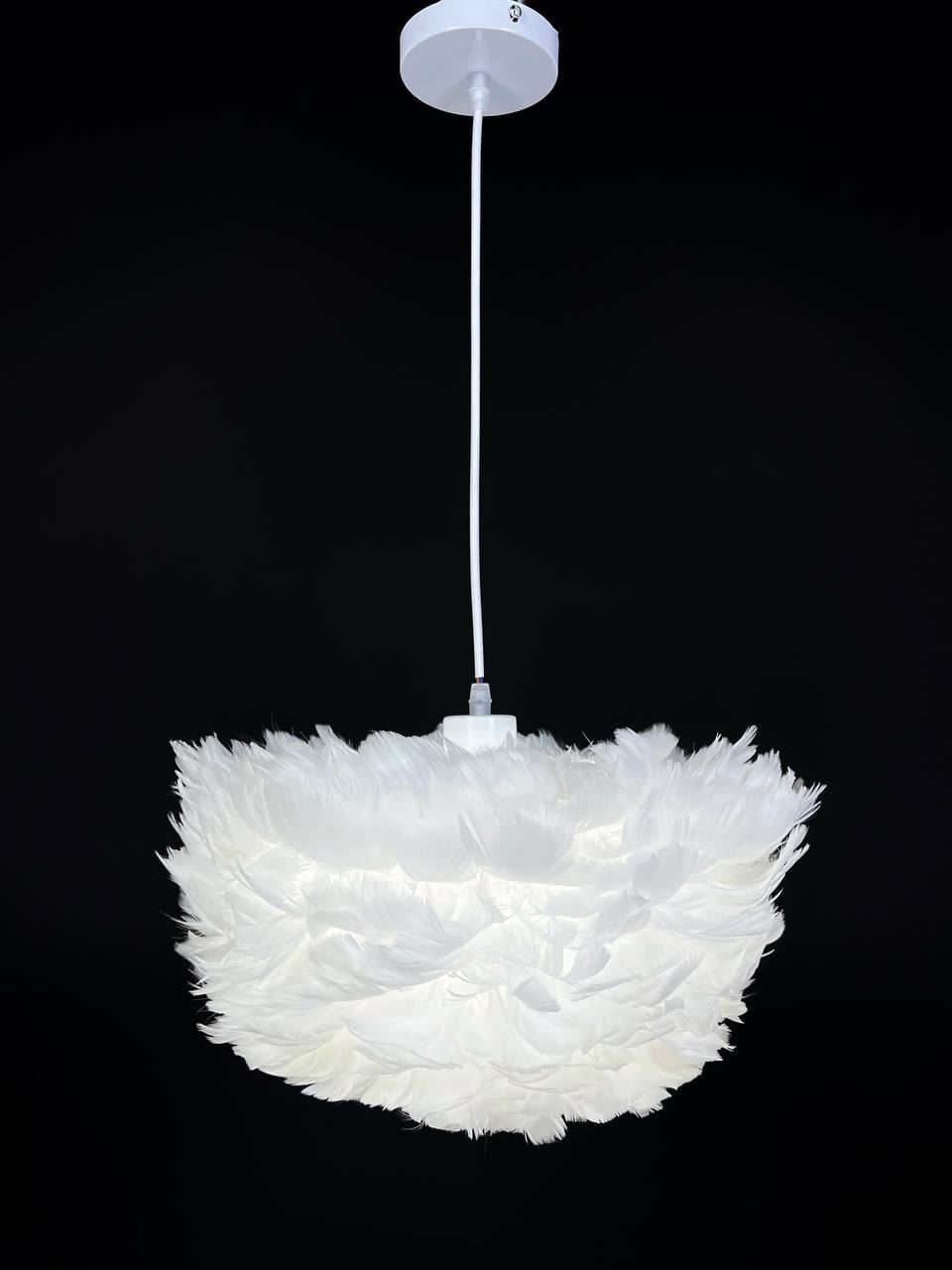 Люстра выполнена в стиле флористики и арт-деко, что позволяет ей гармонично вписаться в любой интерьер. Арматура и плафон изготовлены из металла и пера соответственно, что обеспечивает прочность и долговечность конструкции.
