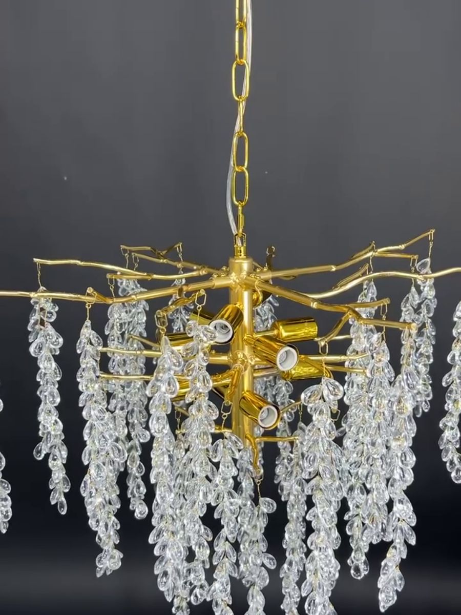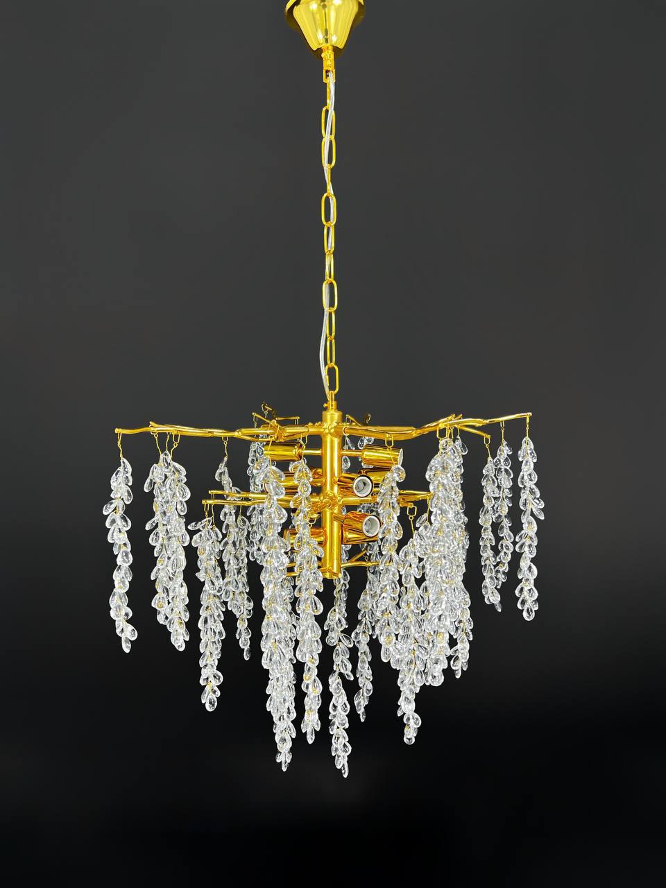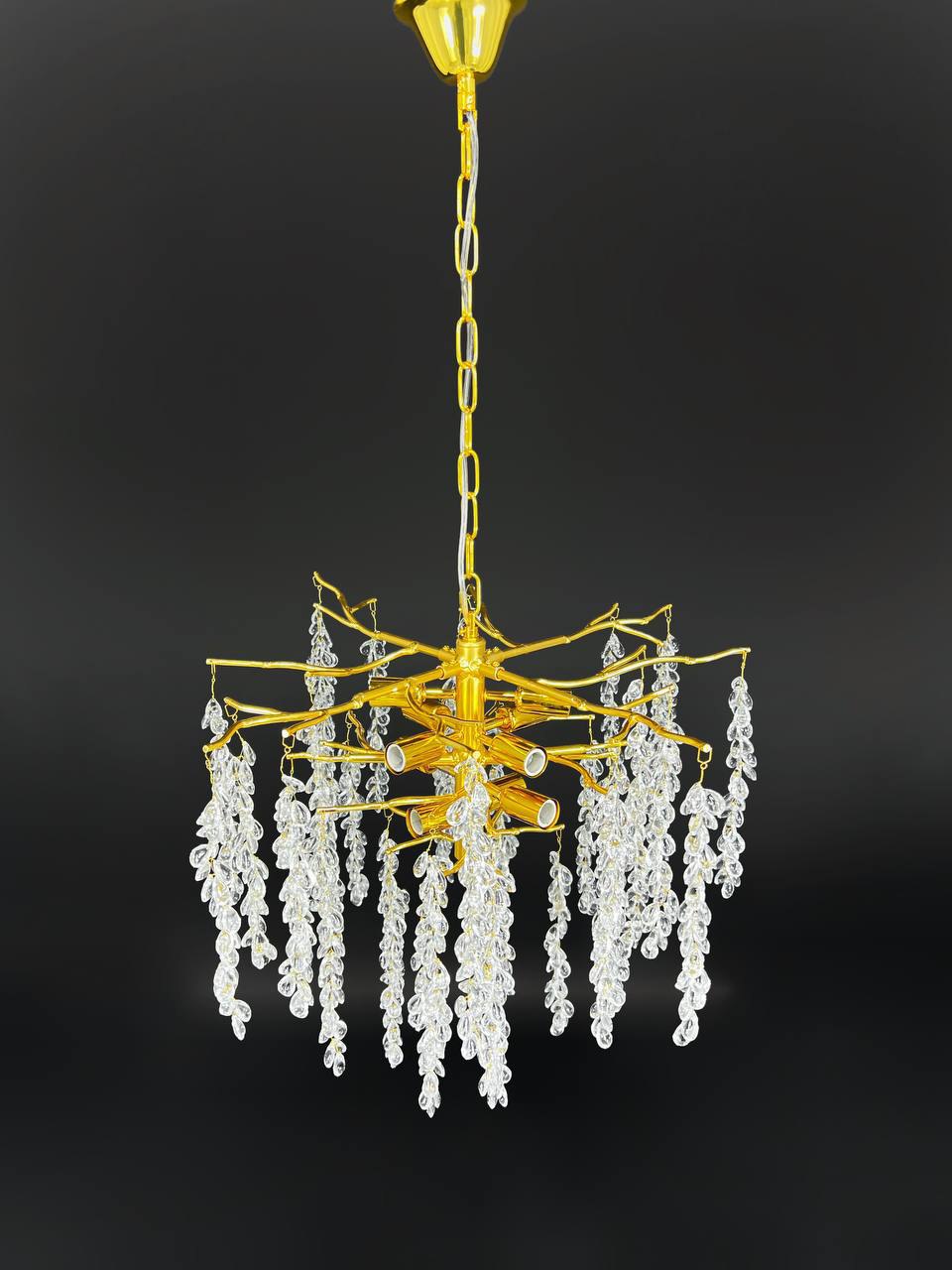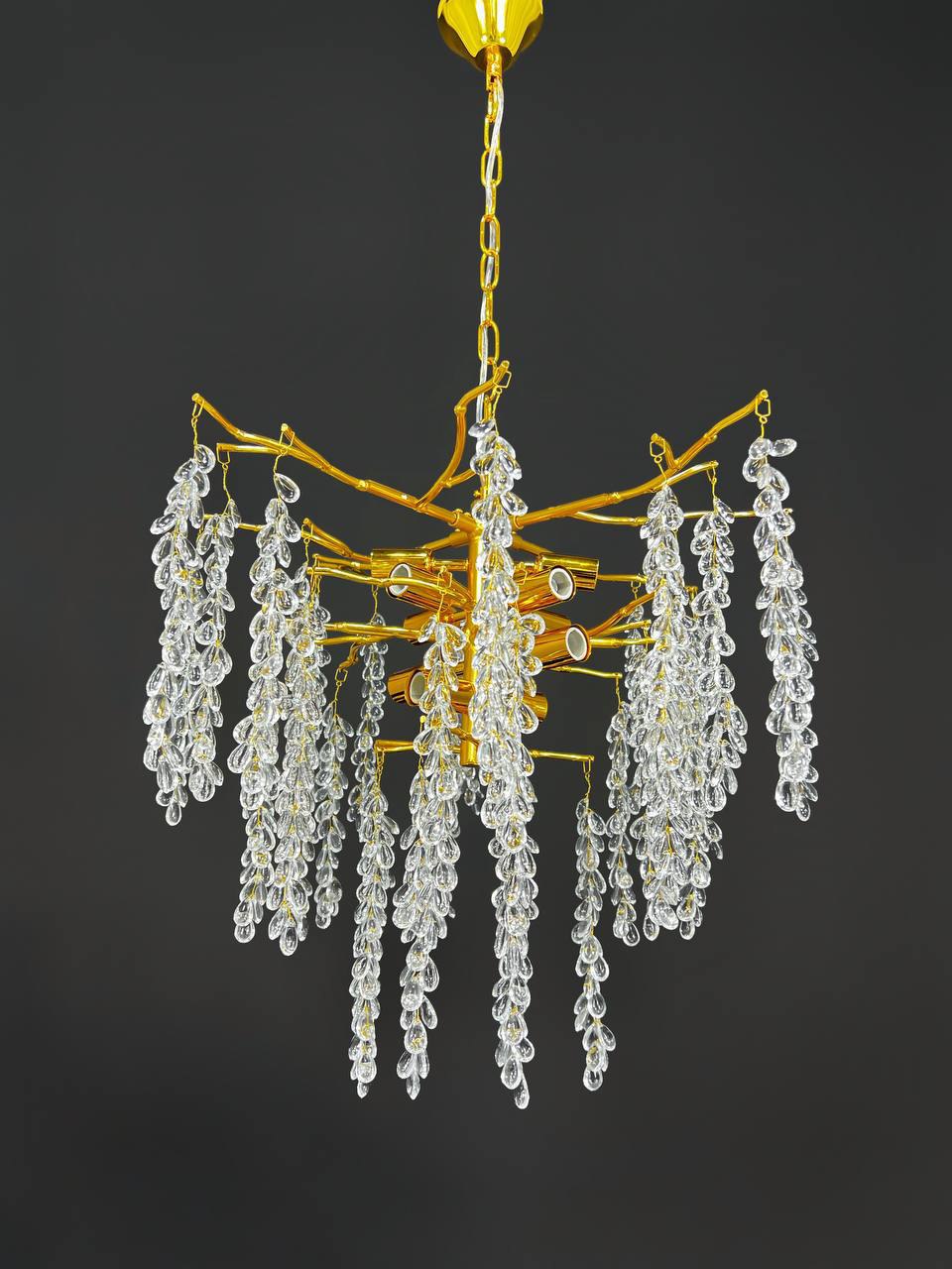 Люстра выполнена в золотом цвете, что придает ей роскошный и элегантный вид. Материал арматуры - металл, а декор изготовлен из стекла, что обеспечивает равномерное и мягкое освещение.