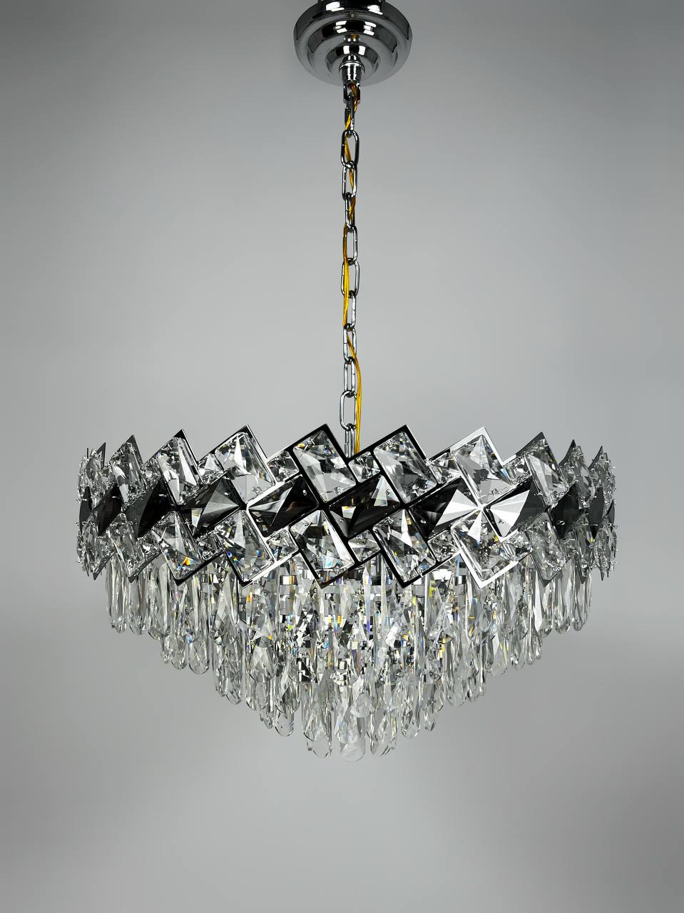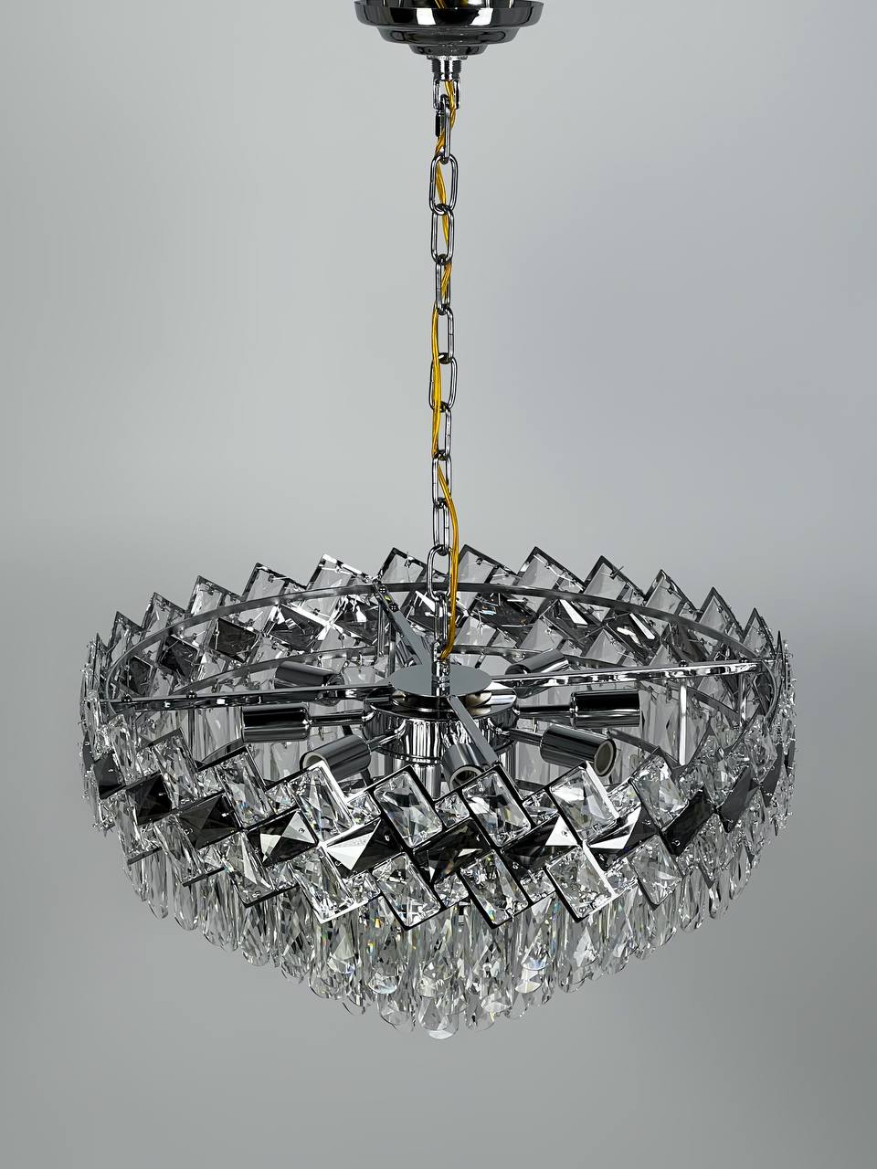 Плафон люстры выполнен из стекла и имеет прозрачное и дымчатое стекло, что придает ей изысканный и элегантный вид. Крепление в комплекте и регулировка по высоте позволяют легко установить и настроить люстру под ваши нужды.