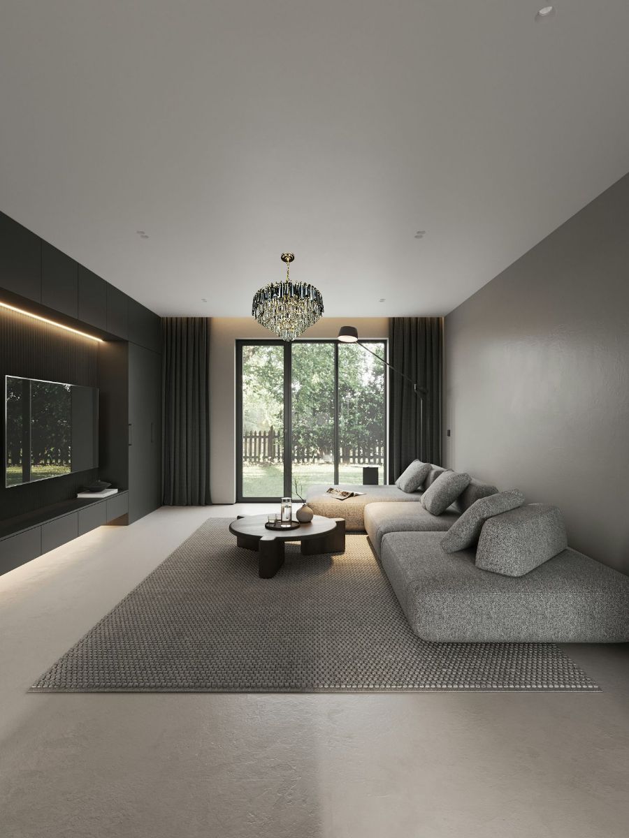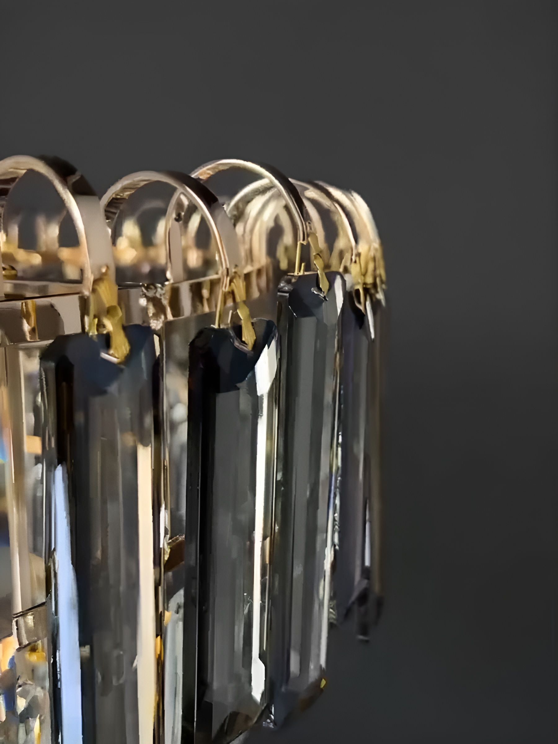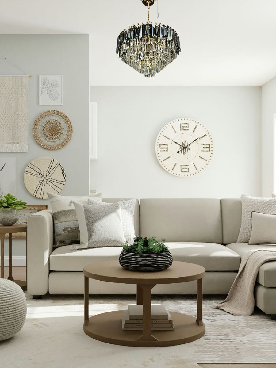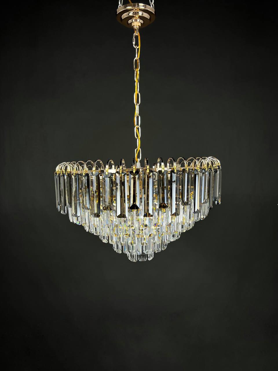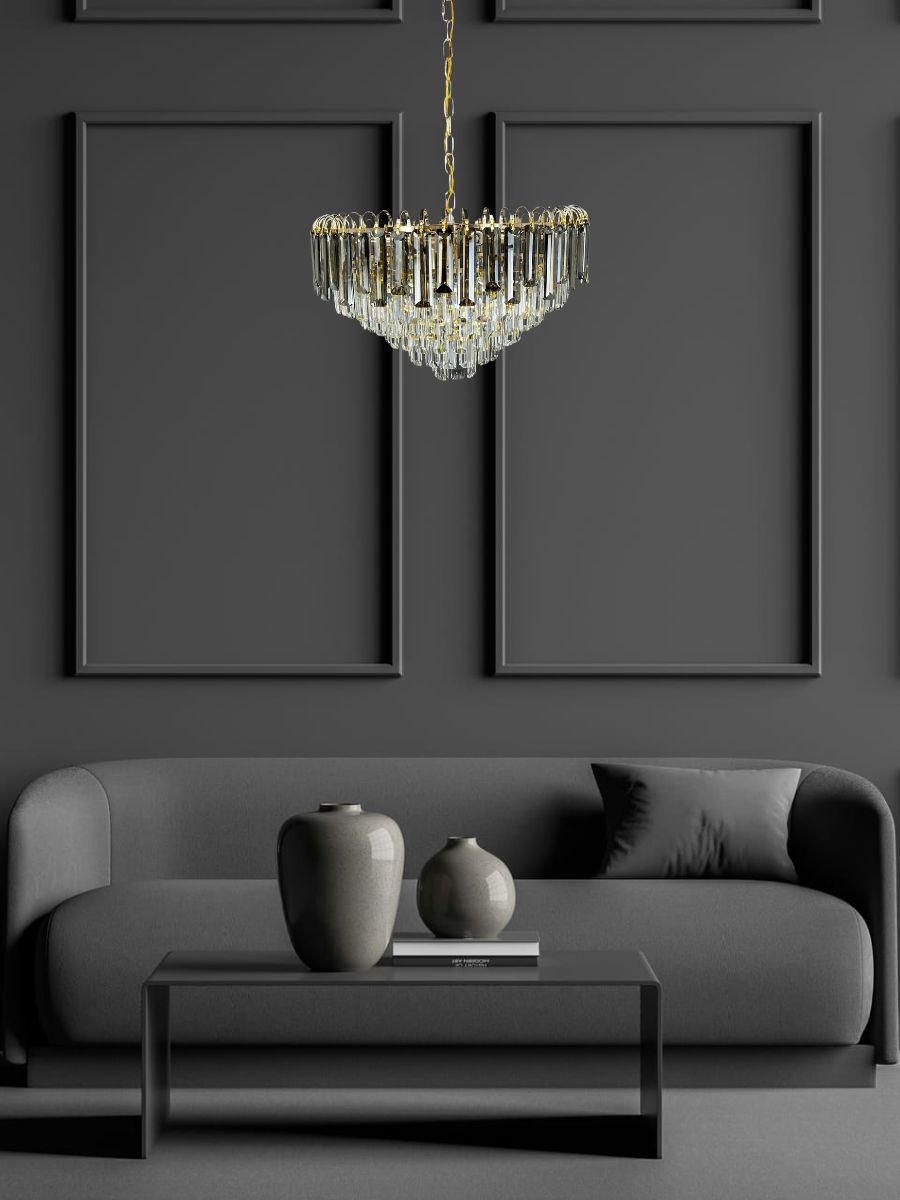 Прозрачный плафон и каскадная форма люстры создают эффект легкости и воздушности, делая интерьер более светлым и просторным.