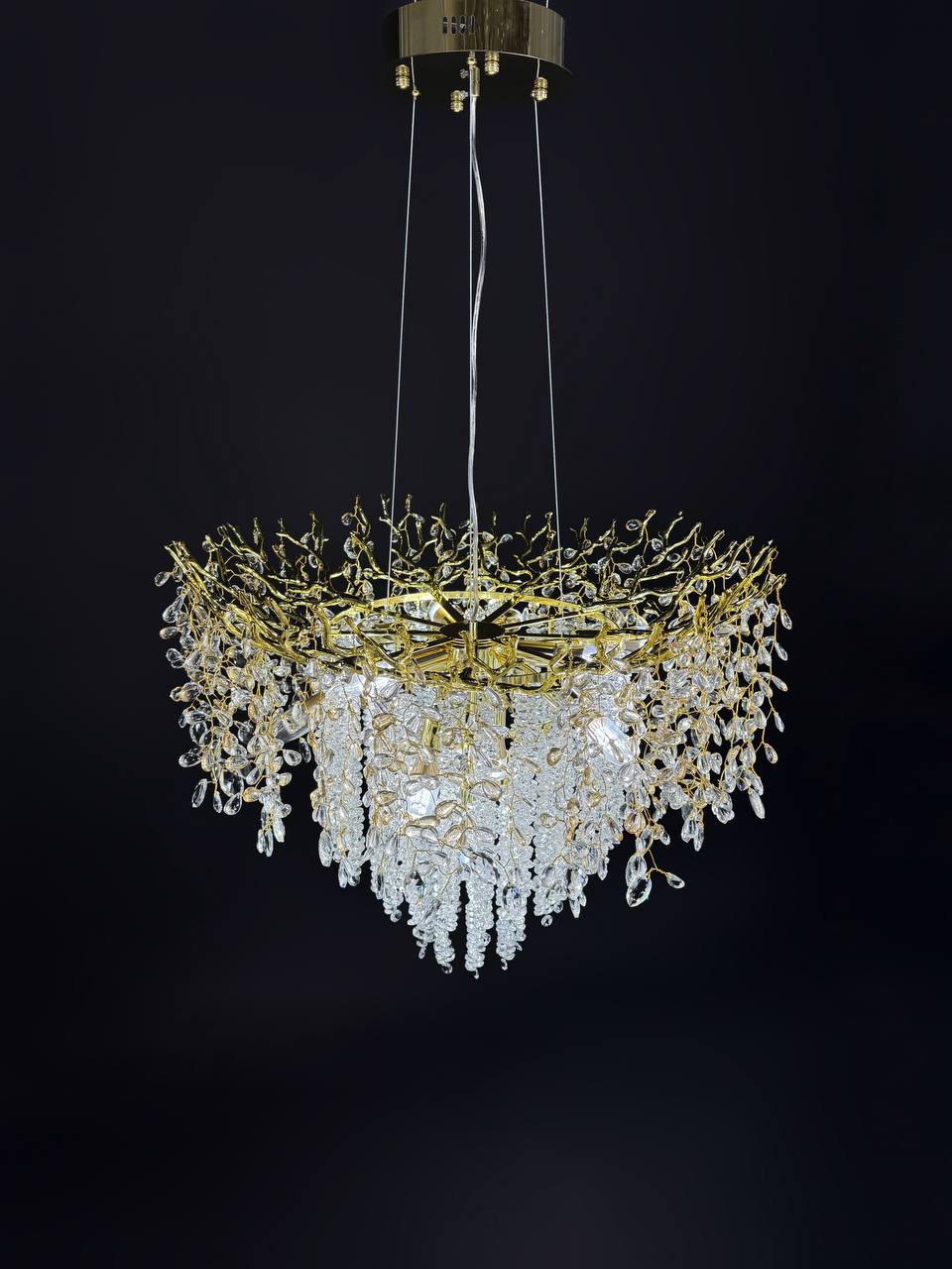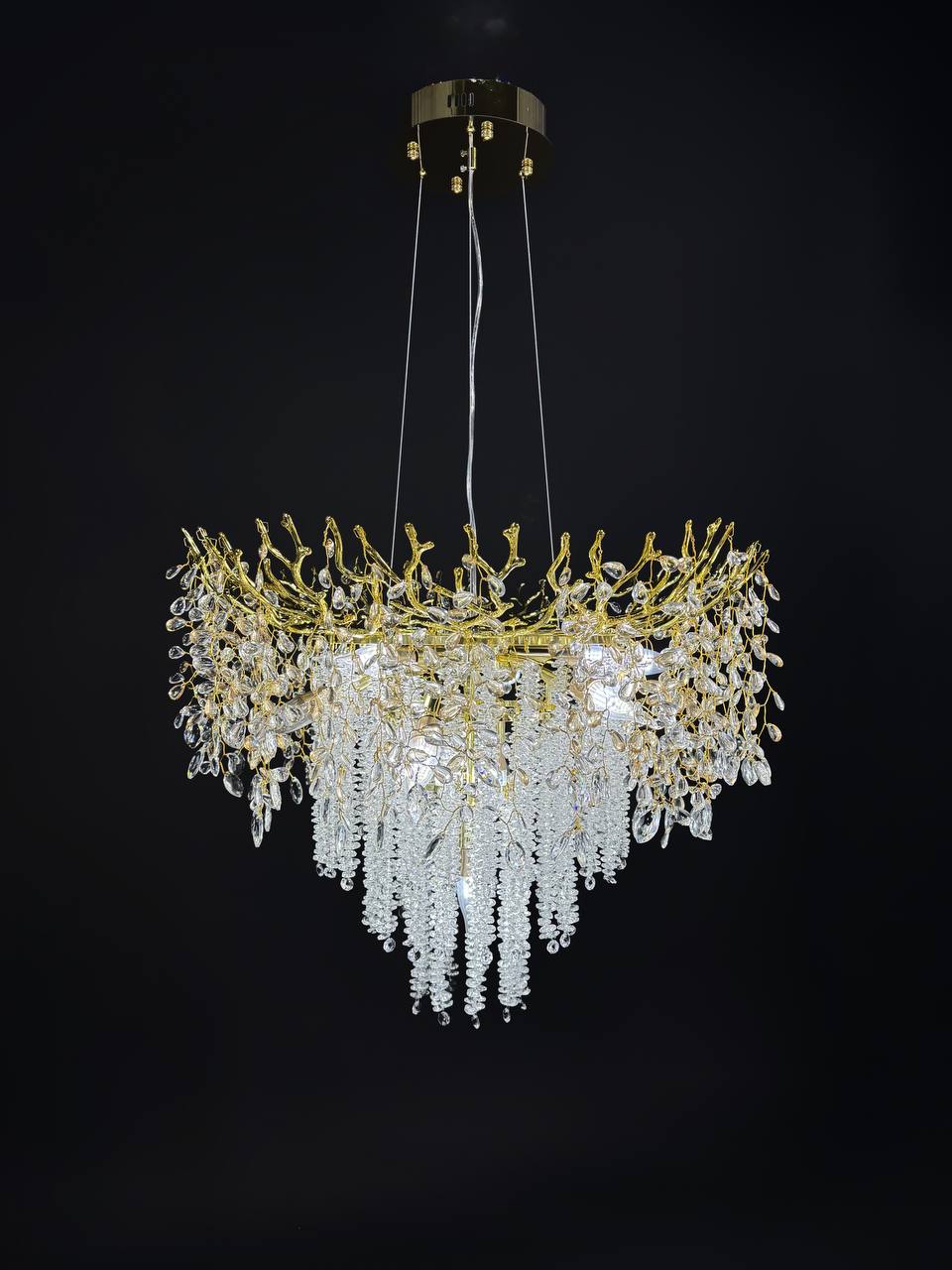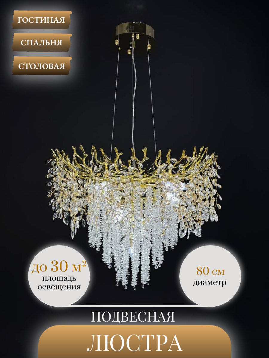 Изысканный дизайн люстры сочетает в себе утонченную роскошь золота и блеск хрустальных подвесок, создавая атмосферу утонченной элегантности. Уникальная форма с каскадными подвесками создает игру света и тени, делая освещение еще более привлекательным.