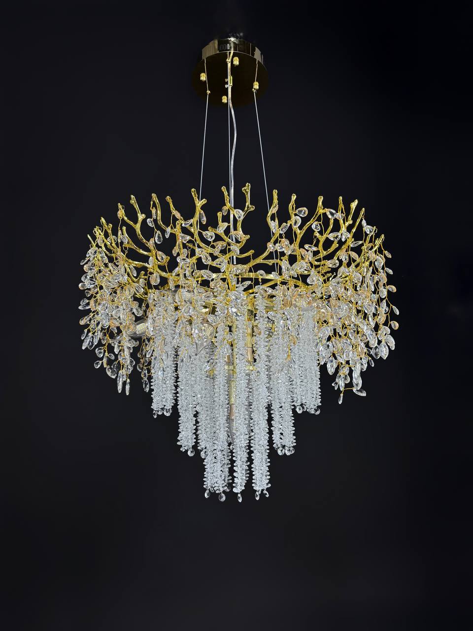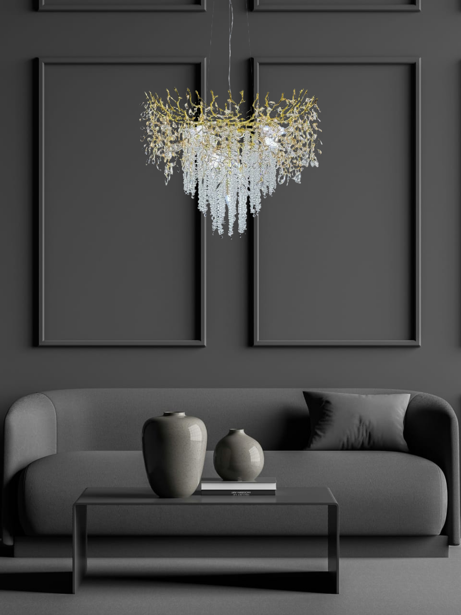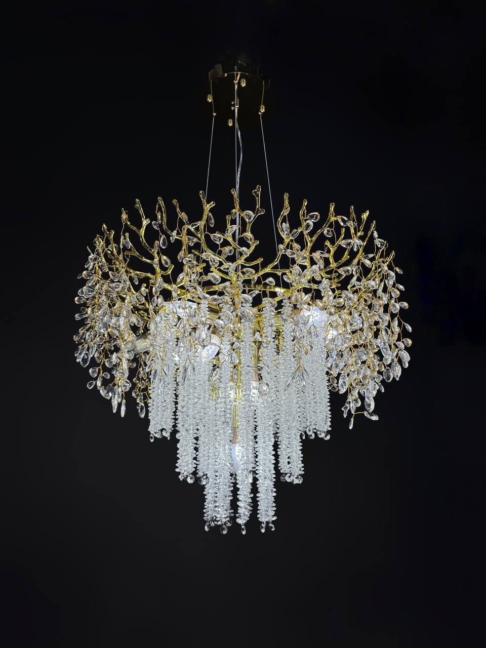 Изысканный дизайн люстры сочетает в себе утонченную роскошь золота и блеск хрустальных подвесок, создавая атмосферу утонченной элегантности. Уникальная форма с каскадными подвесками создает игру света и тени, делая освещение еще более привлекательным.