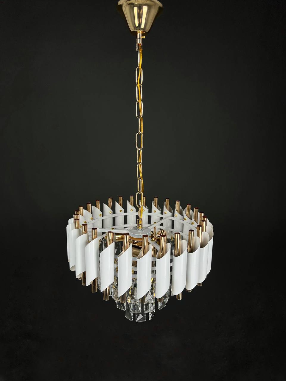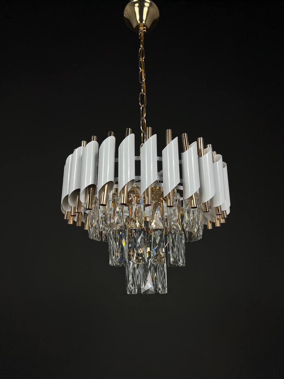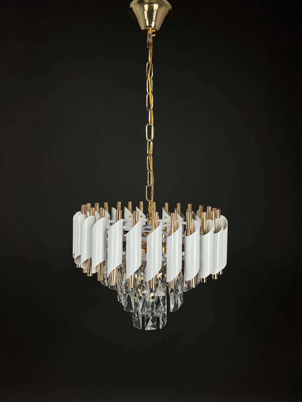 Люстра выполнена в белом цвете с золотыми акцентами, что делает ее подходящей для различных интерьеров. Материал плафона - стекло и металл, что обеспечивает прочность и долговечность конструкции.