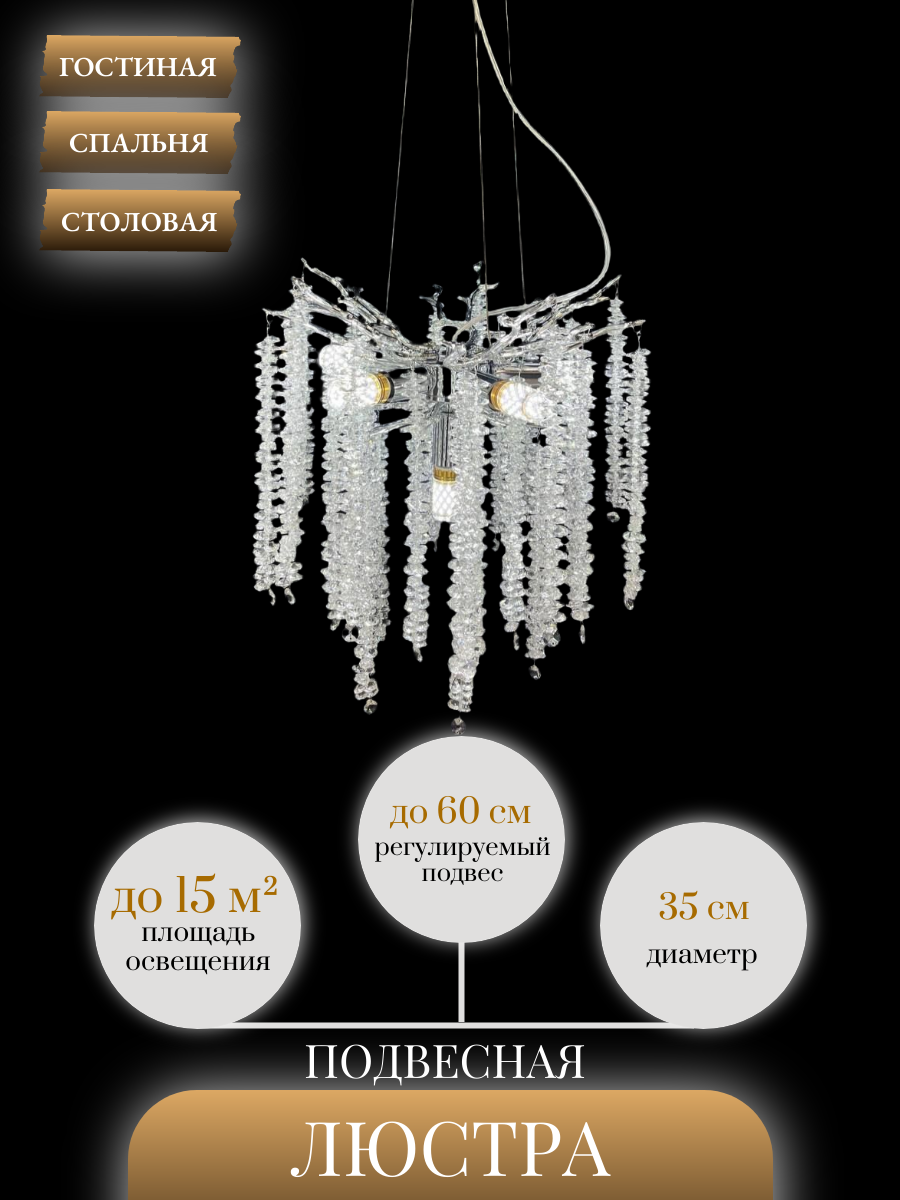 Люстра имеет регулируемую высоту от 400 до 1000 мм, что позволяет адаптировать ее под любой потолок. Диаметр основания составляет 140 мм, что делает ее удобной для установки в большинстве помещений.
