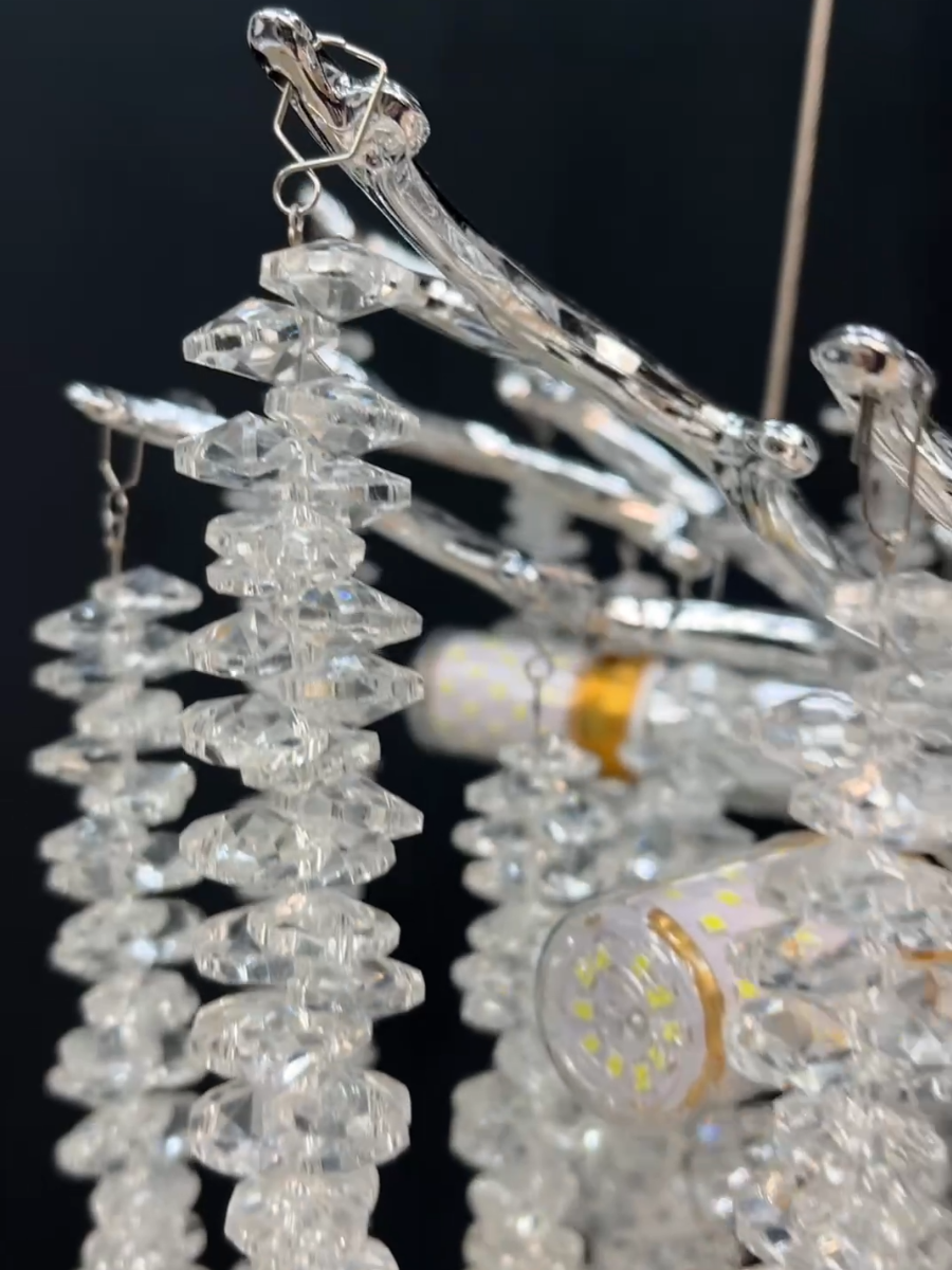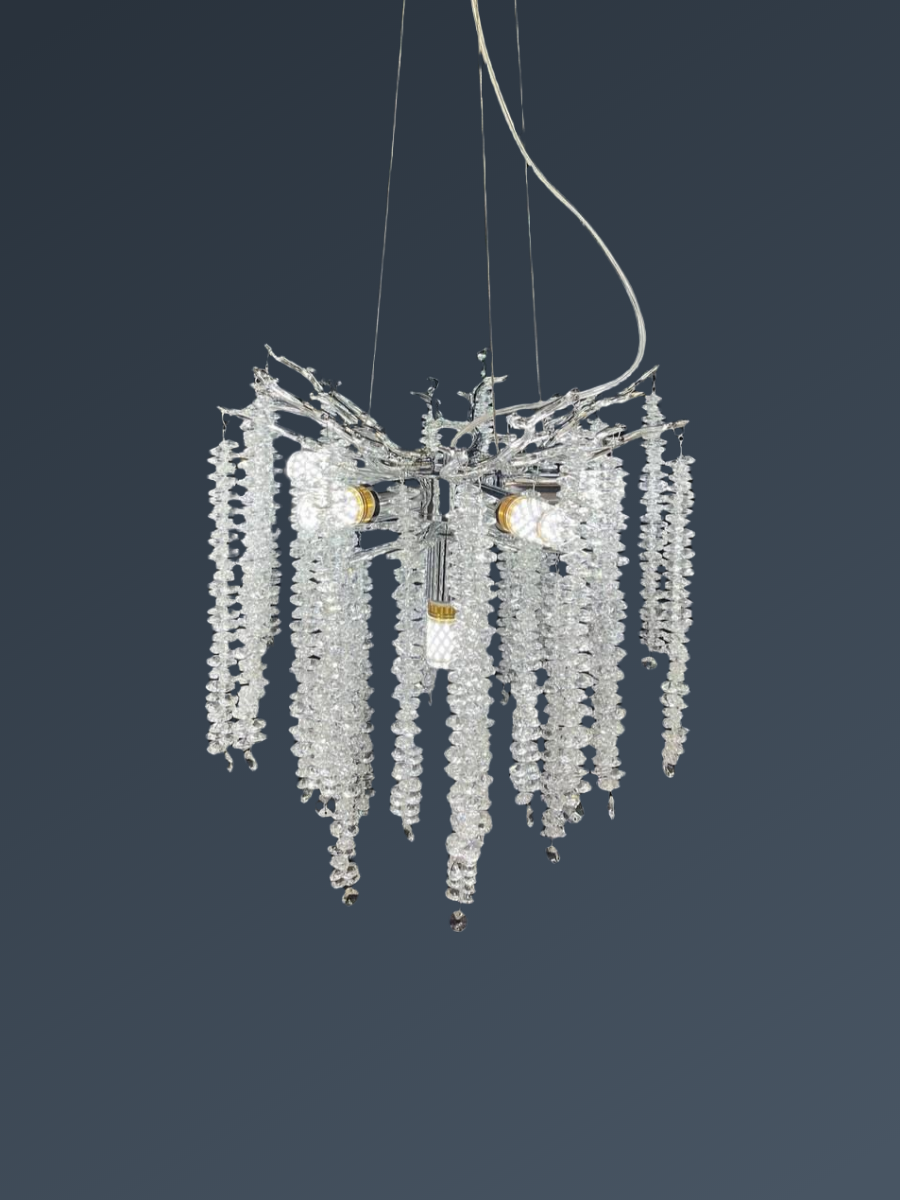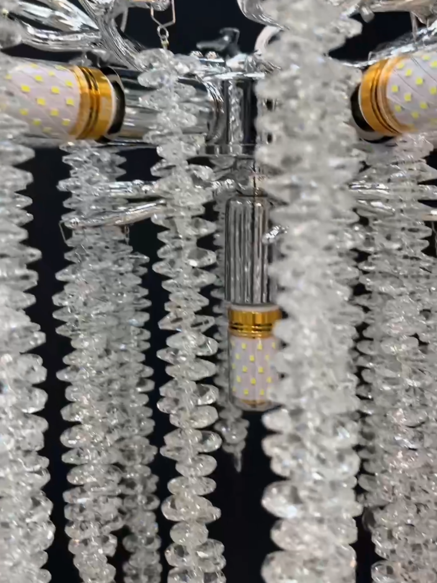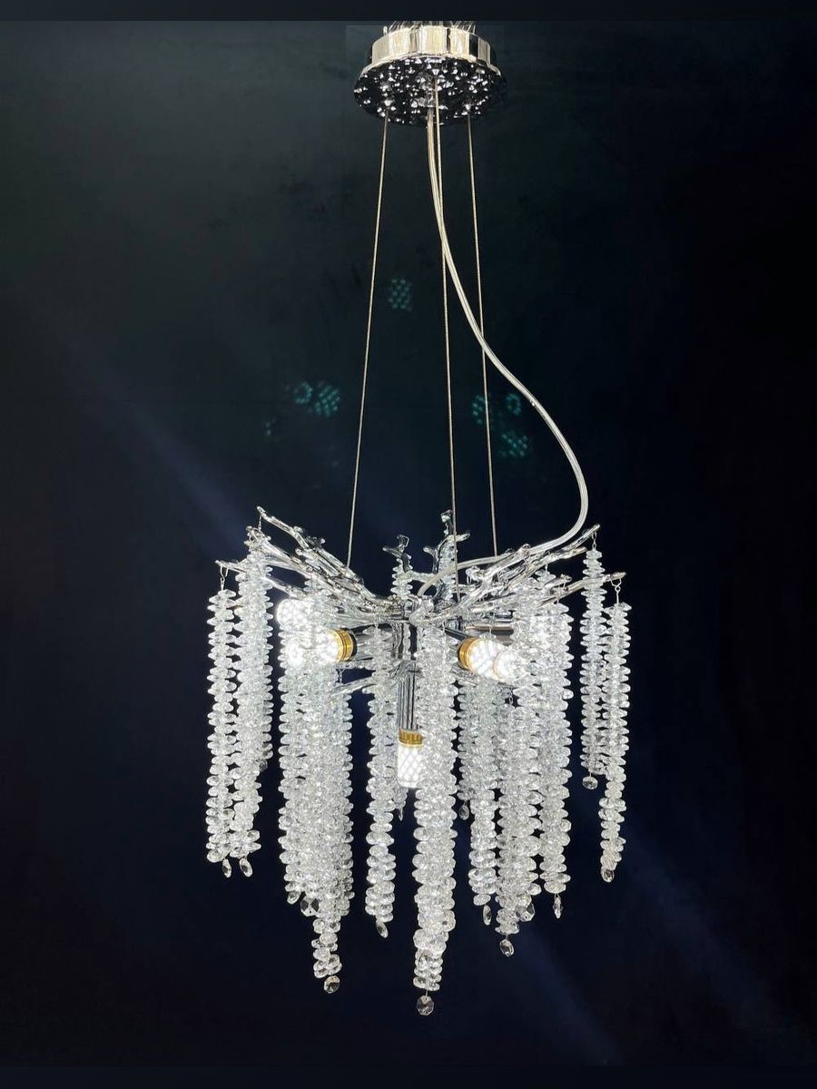 Люстра выполнена из металла с хромированным покрытием, что придает ей современный и стильный вид. Плафоны из прозрачного стекла обеспечивают мягкое и приятное освещение, а также прекрасно рассеивают свет.