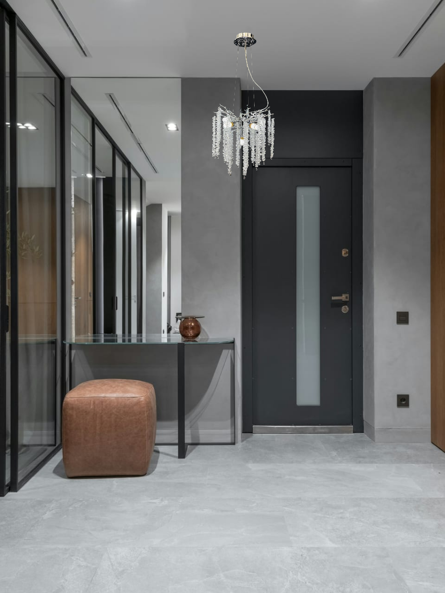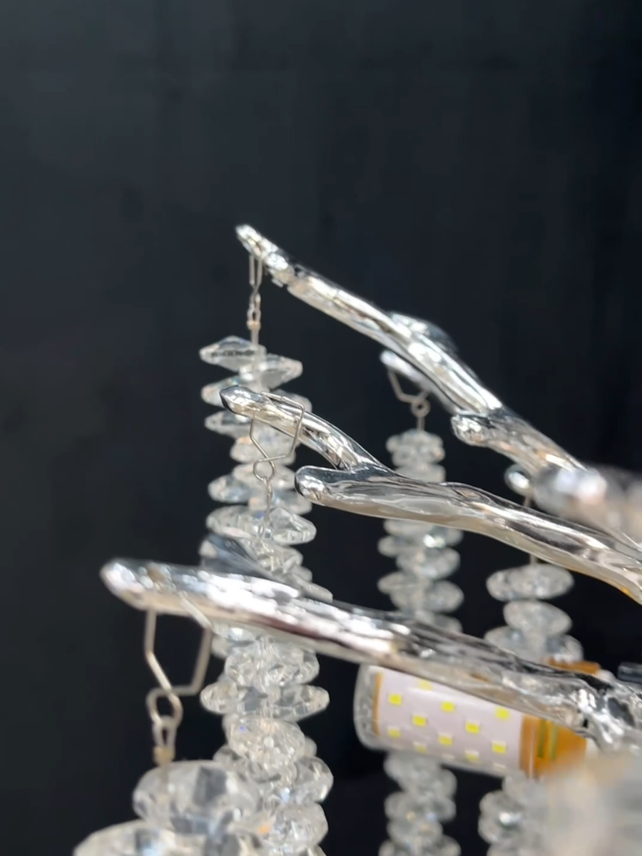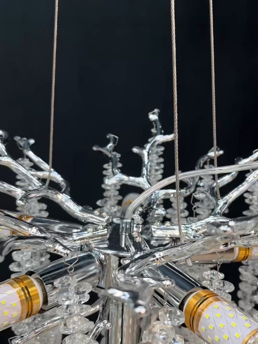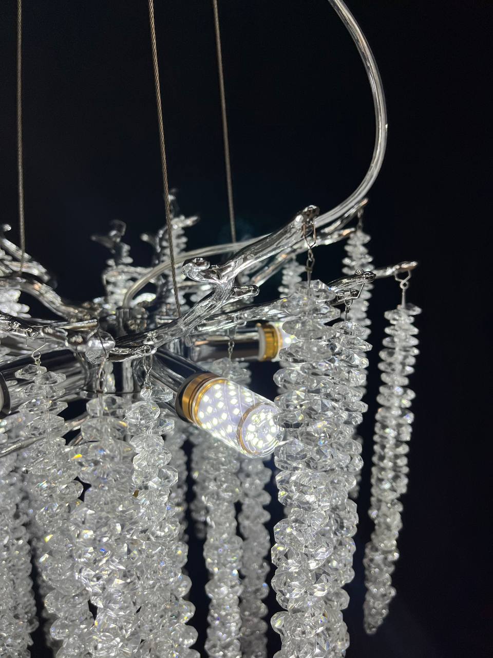 Люстра выполнена из металла с хромированным покрытием, что придает ей современный и стильный вид. Плафоны из прозрачного стекла обеспечивают мягкое и приятное освещение, а также прекрасно рассеивают свет.