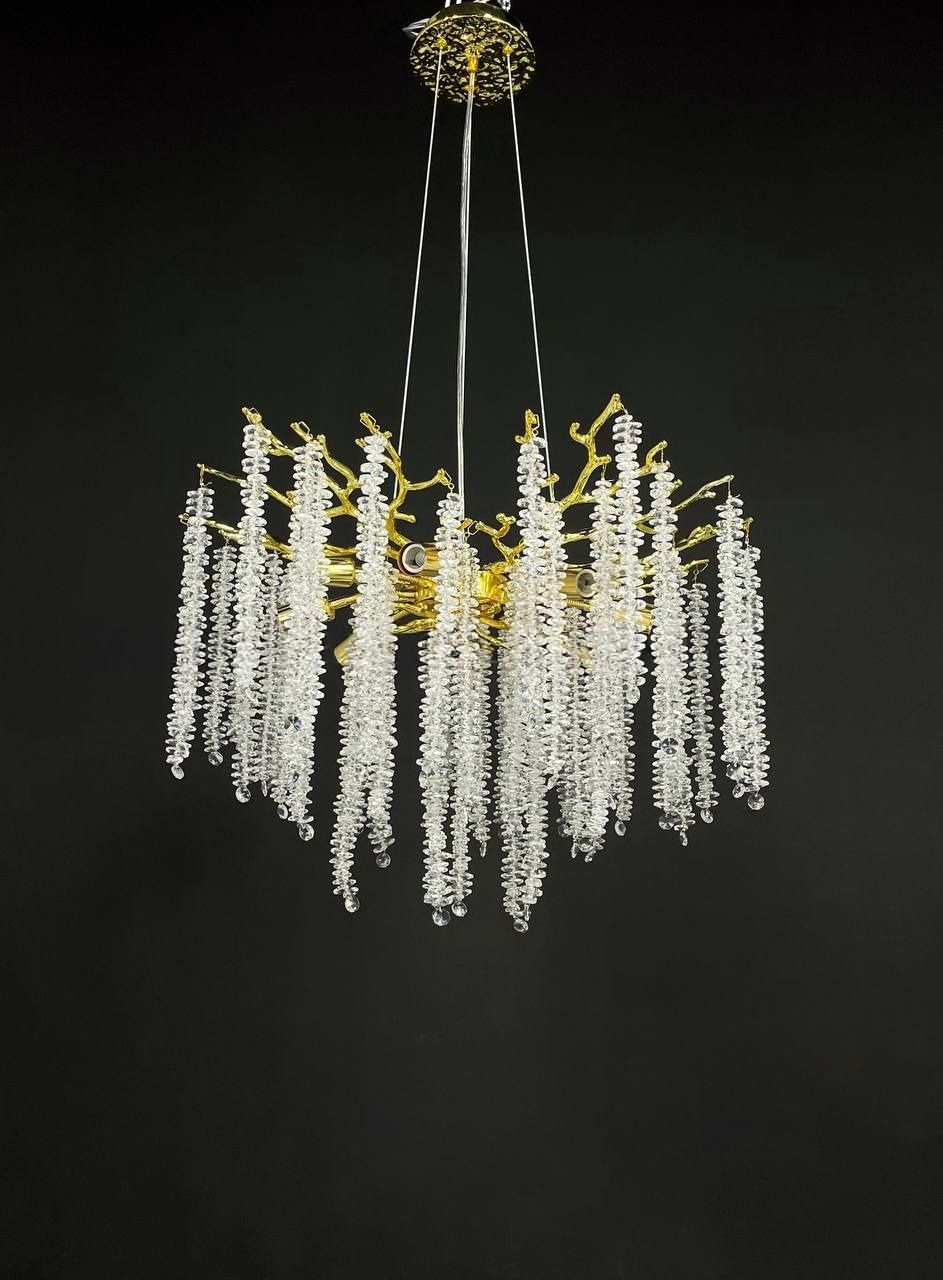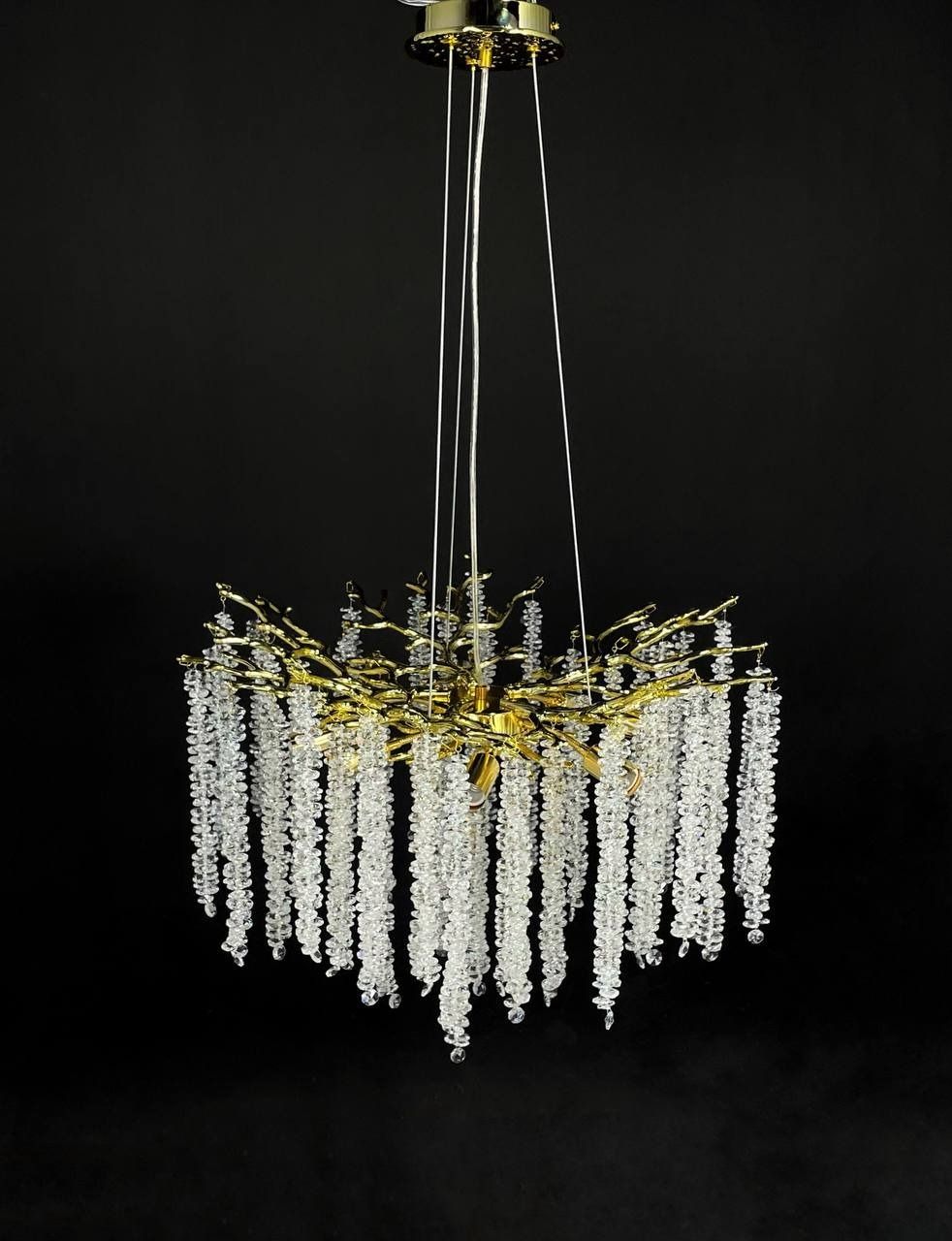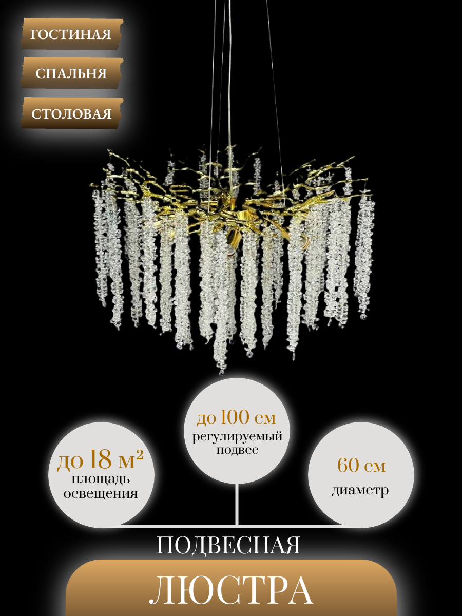 Декор люстры выполнен из прозрачного стекла, что придает светильнику легкость и воздушность. Диаметр люстры составляет 60 см, что позволяет равномерно распределить свет по помещению.