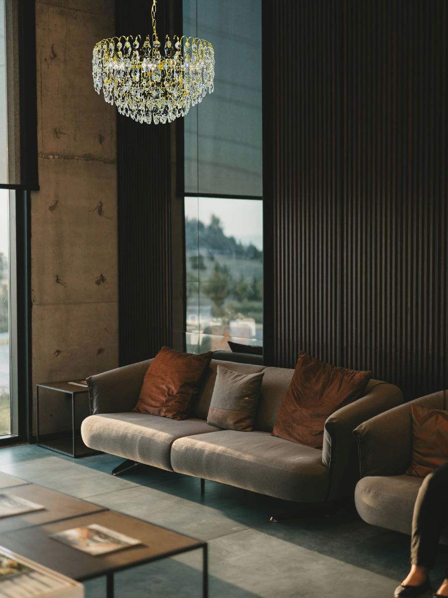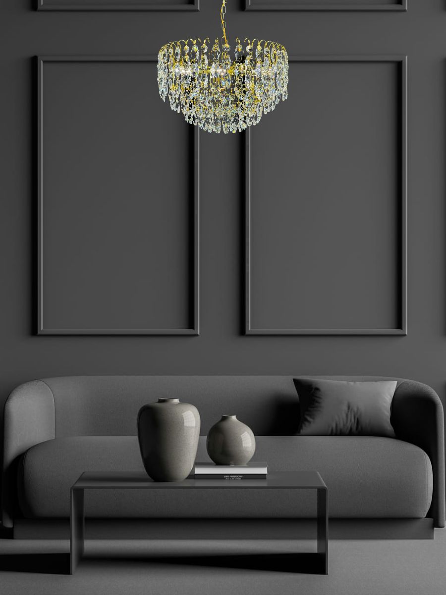 Элегантный золотой корпус и прозрачные стеклянные элементы декора прекрасно сочетаются с современным или классическим интерьером. Регулируемая высота позволяет адаптировать светильник под любые архитектурные особенности помещения.