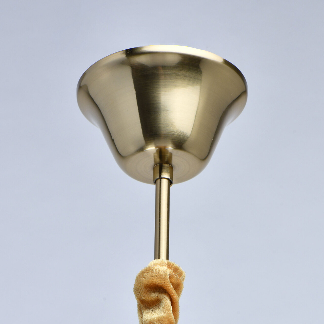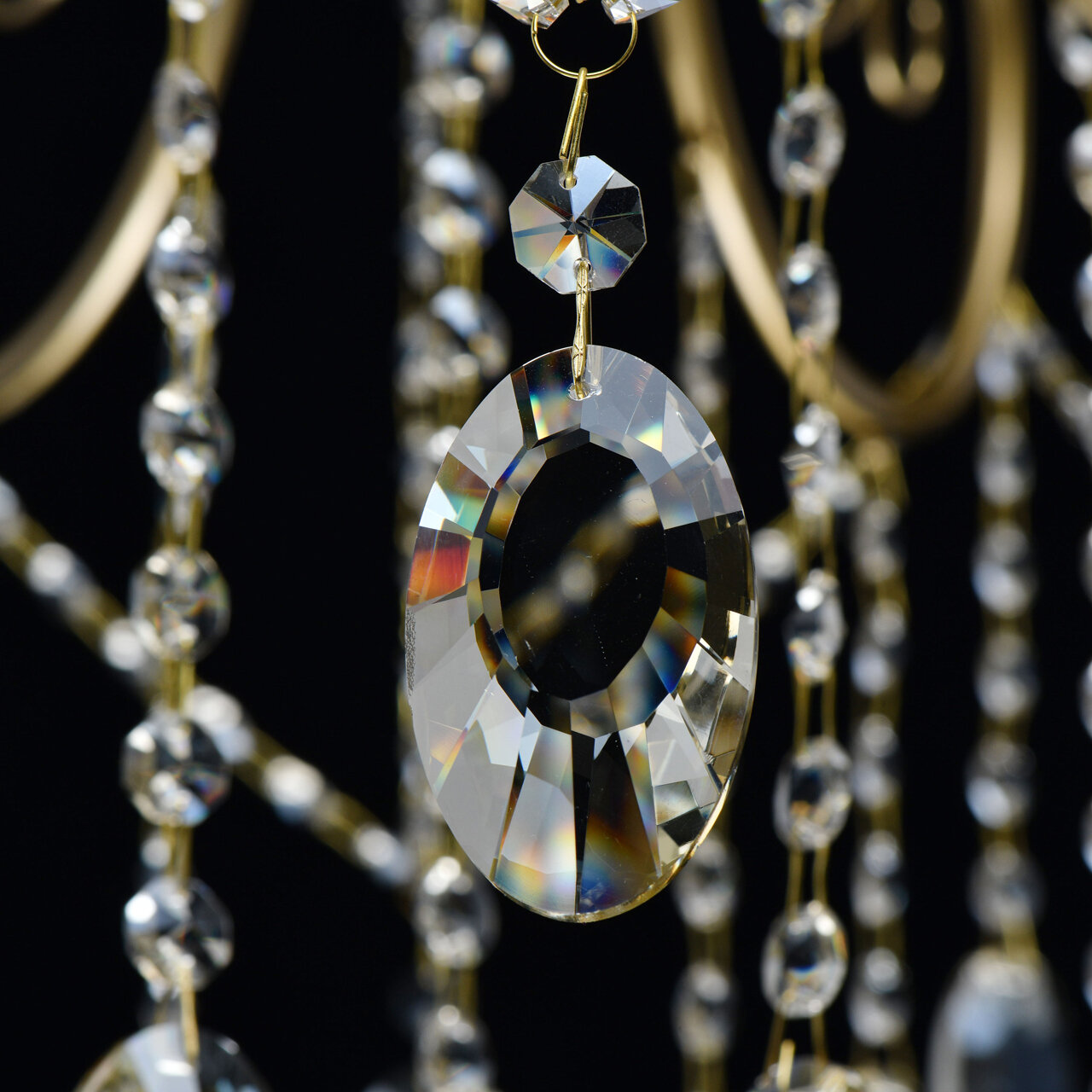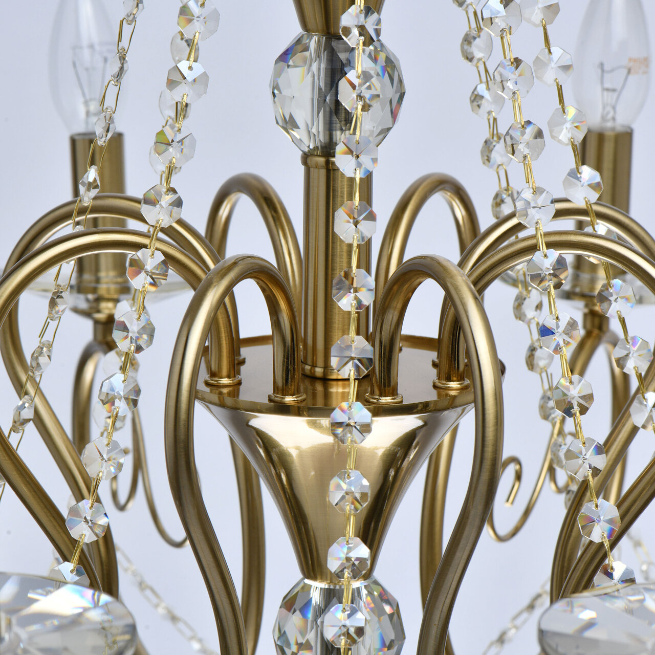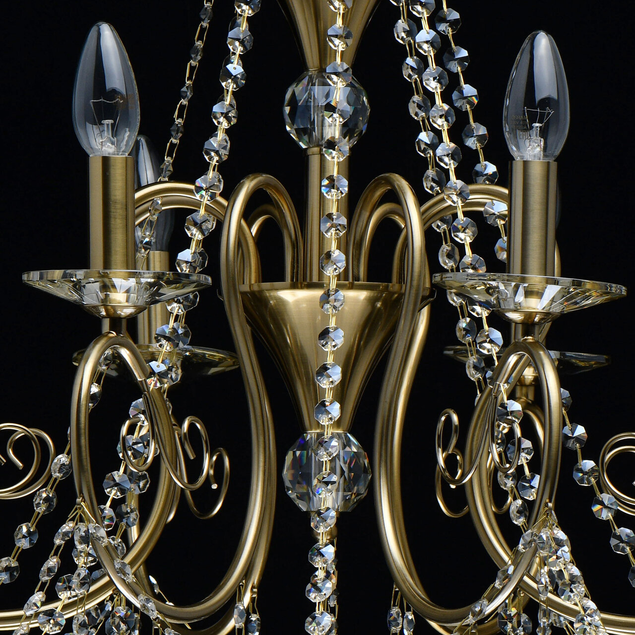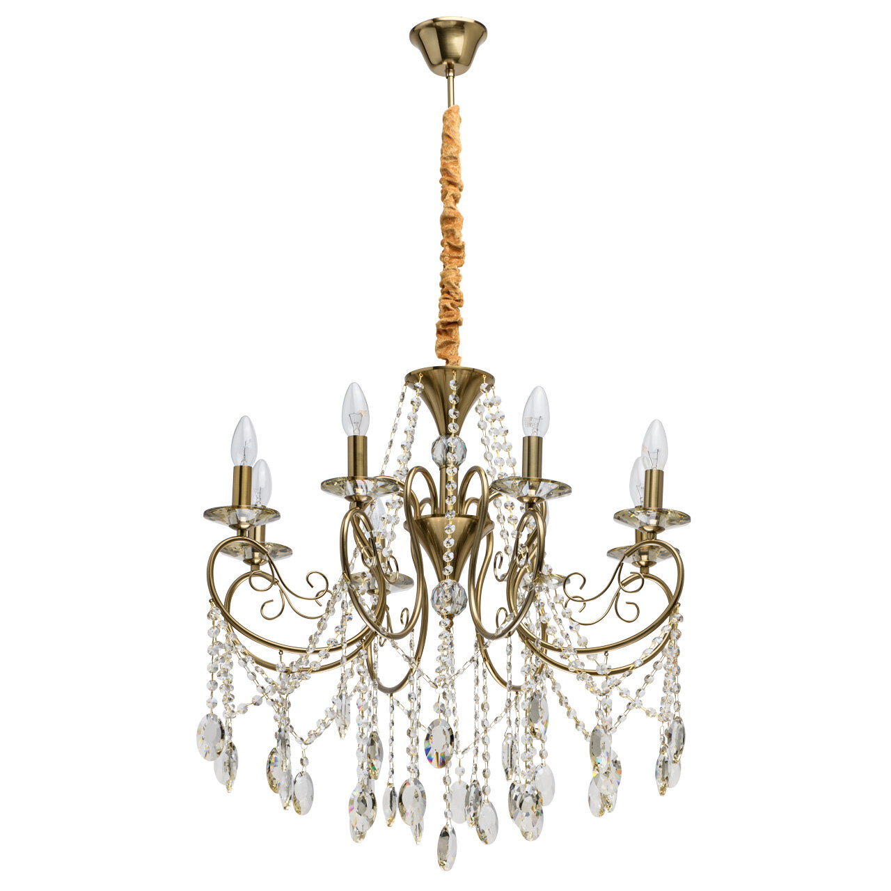 Основание светильника выполнено из металла и гальванизировано в цвет бронзы, что придает ему дополнительную прочность и долговечность. Светильник декорирован массивом хрусталя и хрустальными подвесками цвета шампань, что придает ему изысканный и роскошный вид.