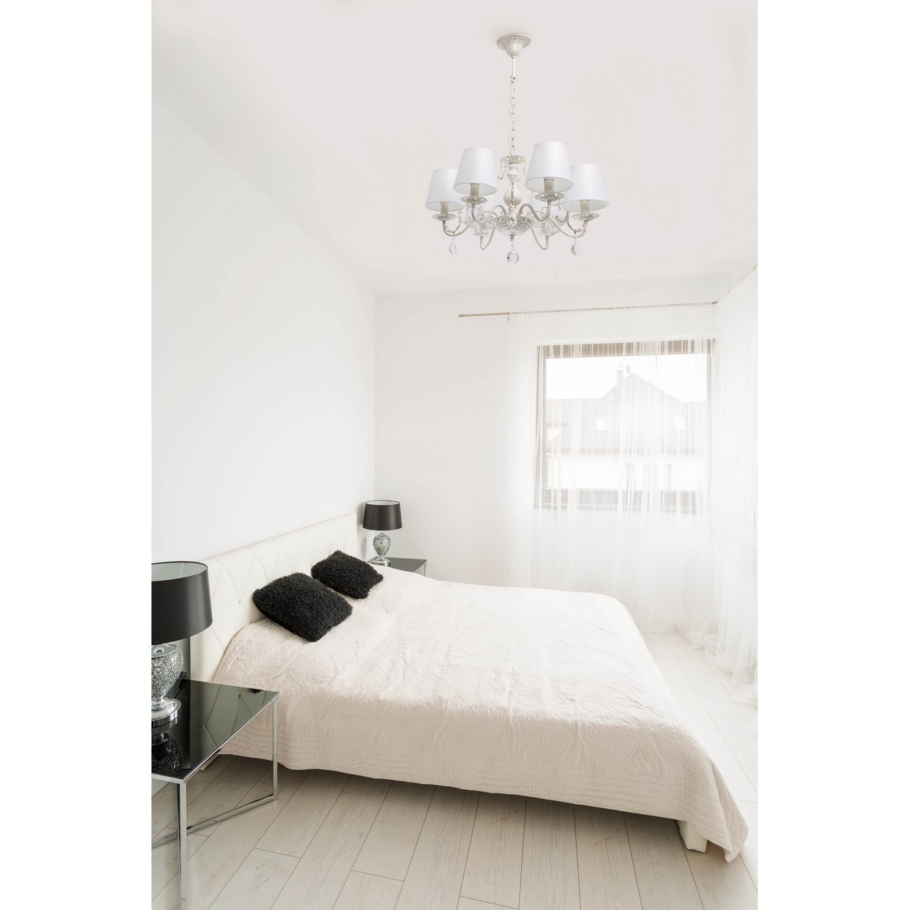 В качестве источников света рекомендуются матовые или прозрачные лампы накаливания или светодиодные модели в форме свечи. Благодаря наличию бра с идентичным дизайном, легко оформить помещение светильниками в едином стиле.