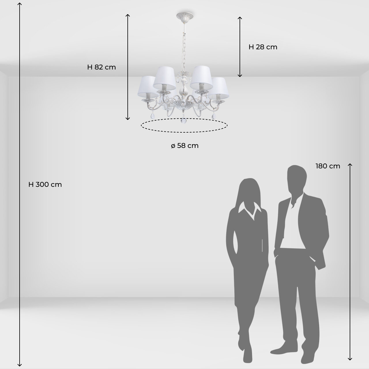 - с учетом подвеса длиной 28 см, подходит для стандартных и высоких потолков;