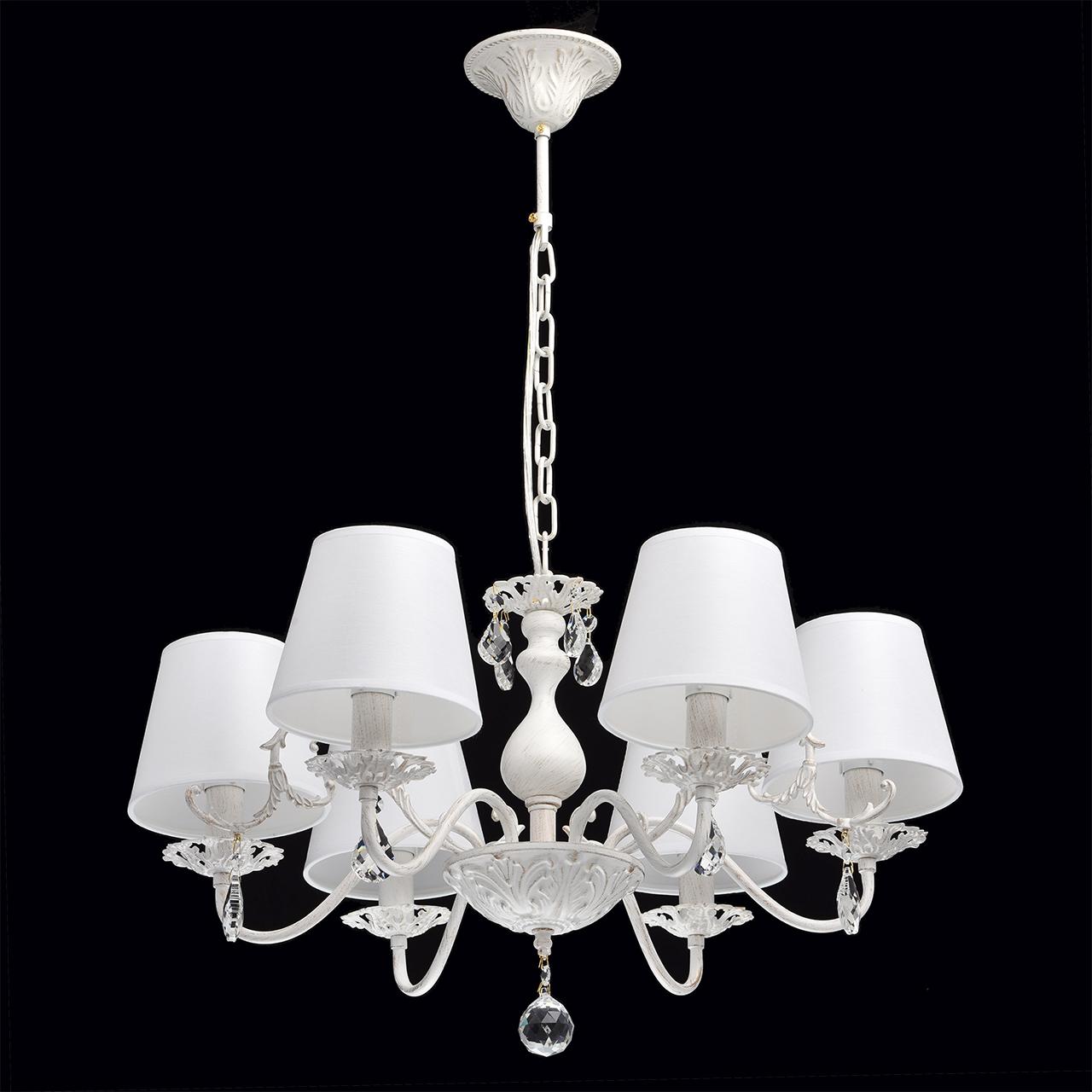 Основание из металлического сплава окрашено в белый матовый тон с эффектом золотой патины, которая создает иллюзию благородной состаренности. От основания спускается подвес в виде цепи длиной 28 см. Декоративная розетка и изящно изогнутые рожки увенчаны тканевыми плафонами с сатиновой текстурой. Особенность модели – в резных элементах и хрустальных каплях, которые украшают люстру и создают световые переливы.