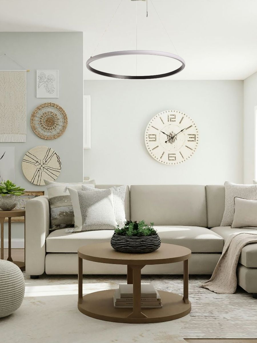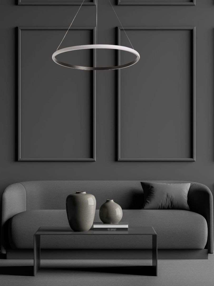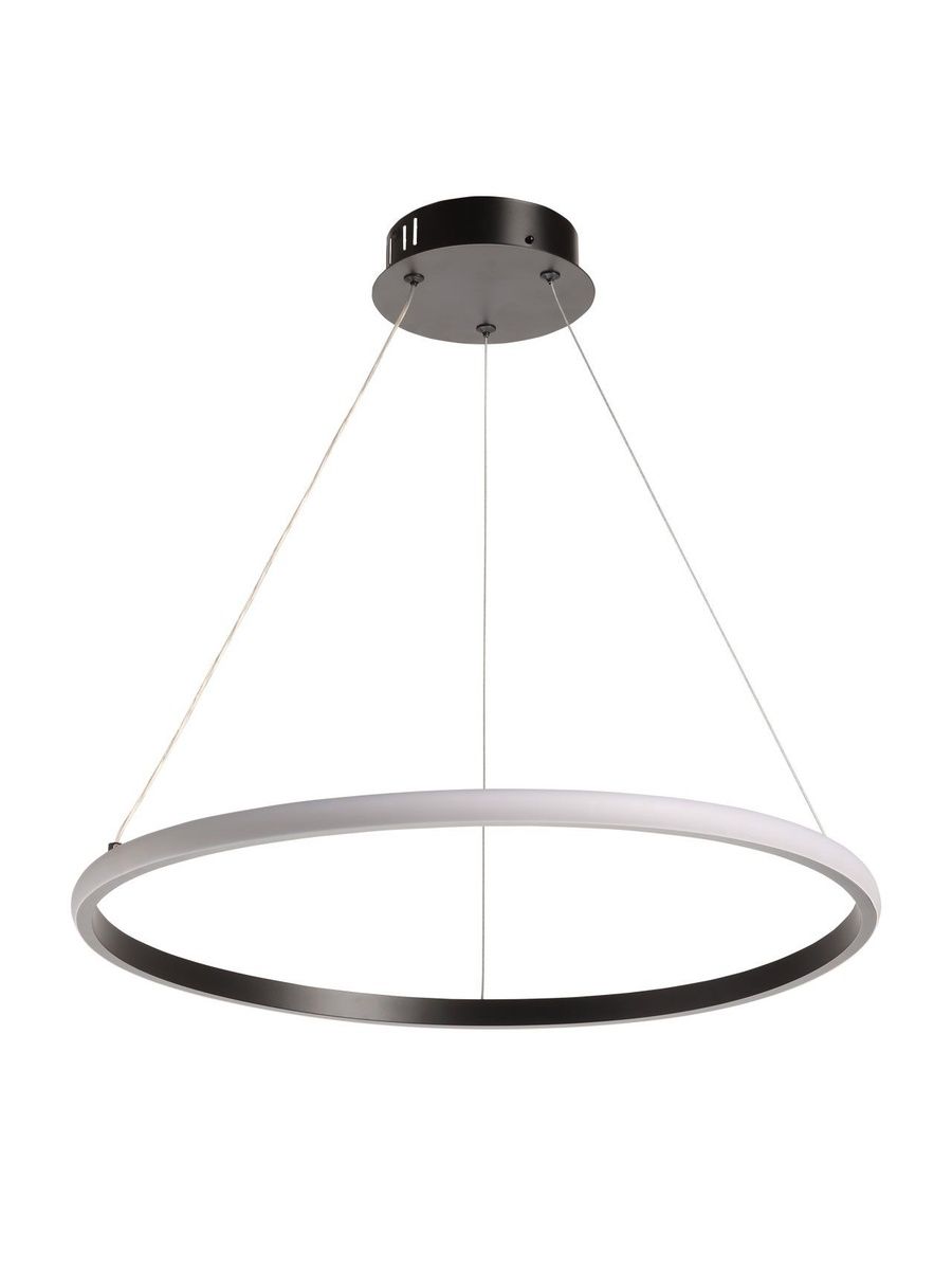 Металлическое основание подвесной люстры окрашено в черный цвет. Корпус плафона выполнен из сплава алюминия с цинком и окрашен в цвет основания. Светодиодные источники света закрыты белым матовым силиконом.