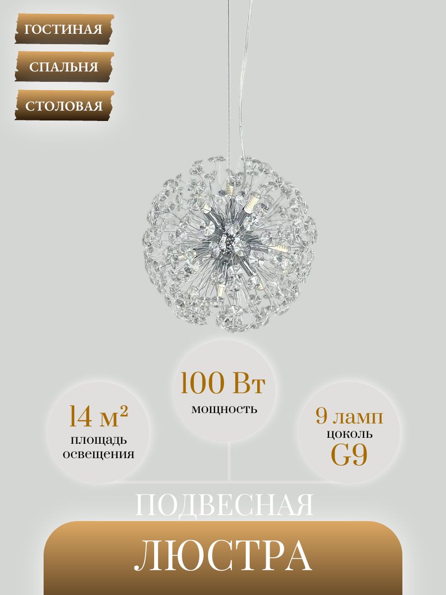 Представляем вашему вниманию подвесную светодиодную люстру Lanbos Салют. Люстра оснащается девятью светодиодными лампами G9 мощностью до 15 Вт каждая. Это обеспечивает яркое и равномерное освещение помещения площадью до 14 квадратных метров. Плафон люстры выполнен из прозрачного стекла, что позволяет свету равномерно распределяться по помещению.