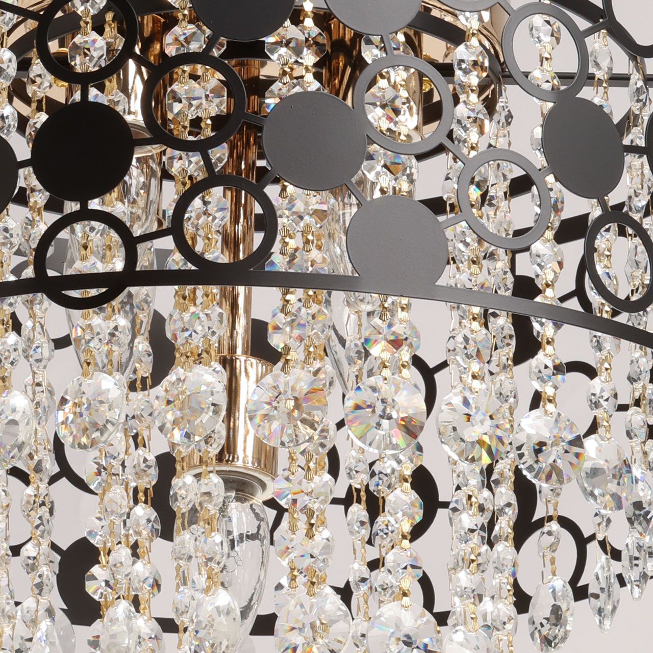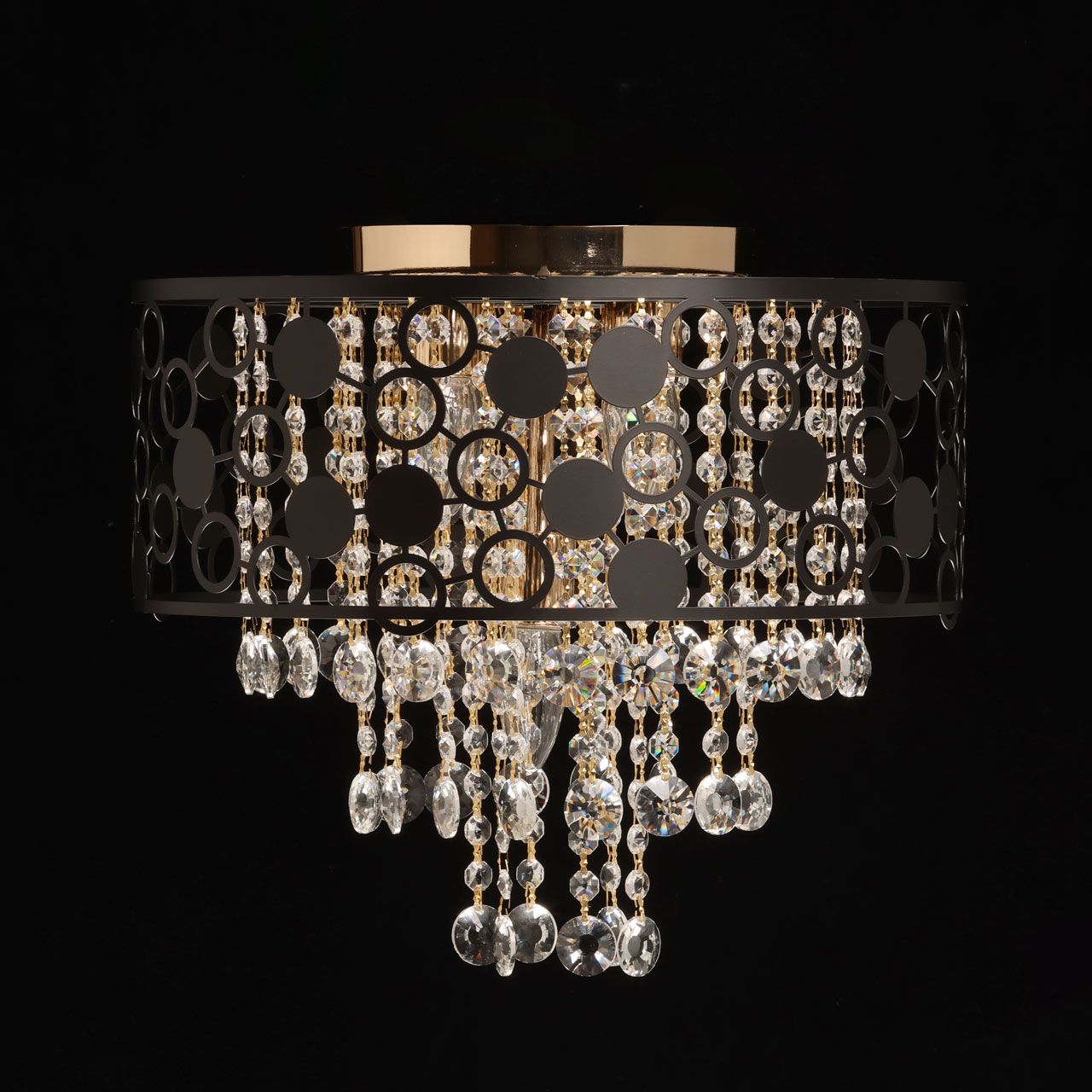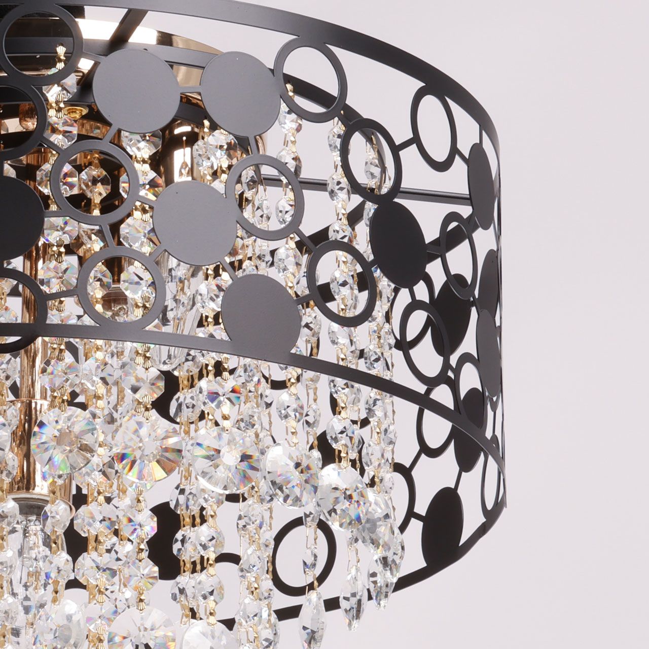 Металлическое основание светильника гальванизировано в цвет золота, а металлический плафон с геометричным орнаментом, выполненным по технологии лазерной резки, окрашен в черный цвет. Люстра декорирована прозрачным хрусталем круглой формы.