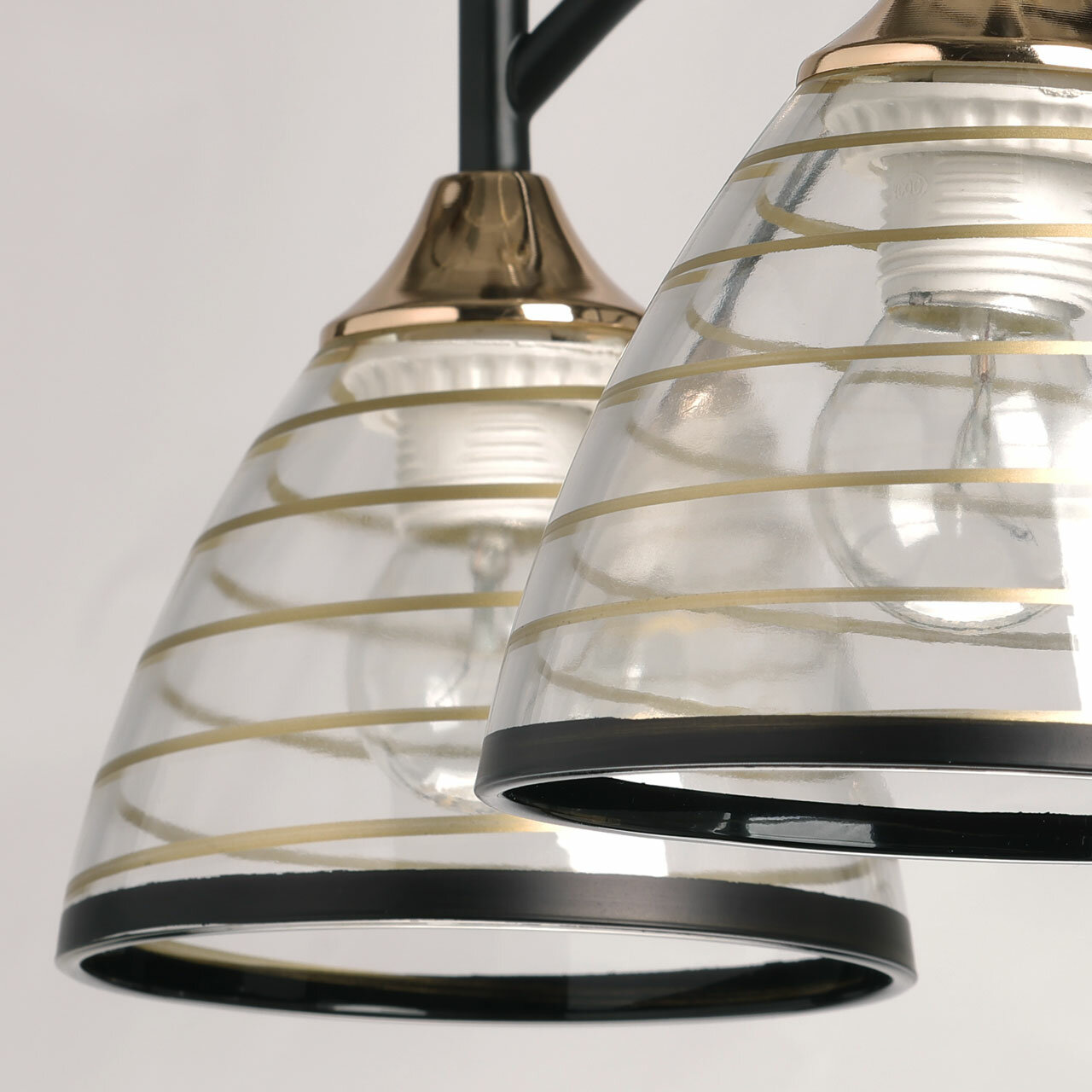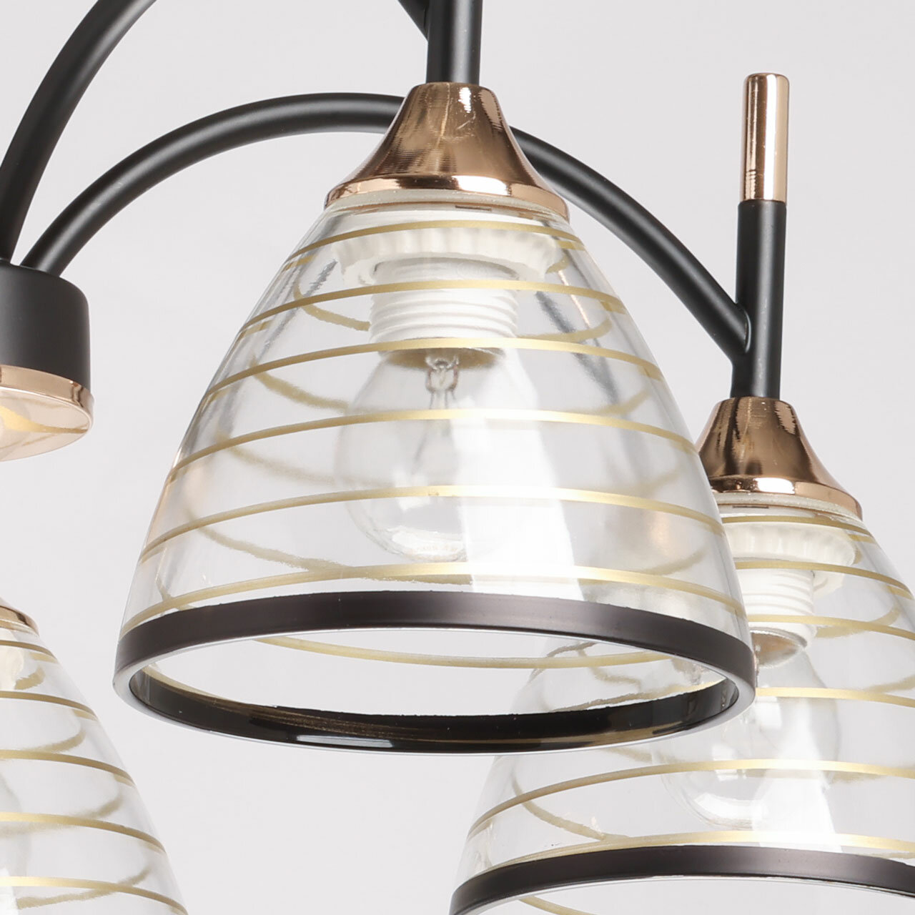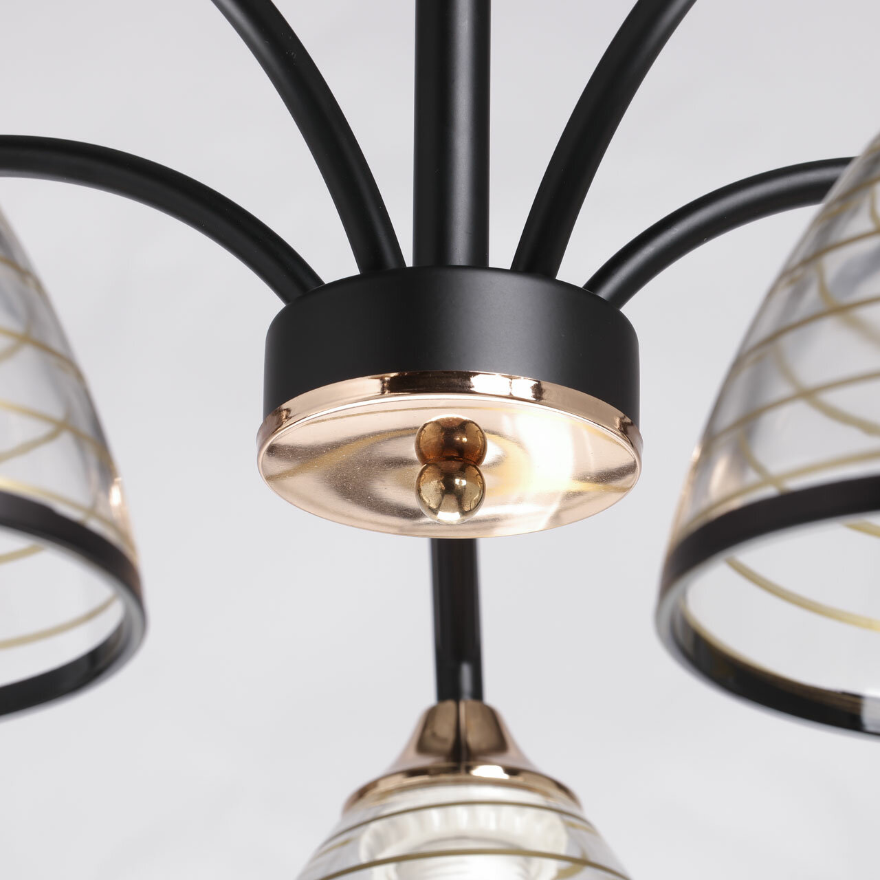 Люстра выполнена в черном цвете с элементами золотистого оттенка, что придает ей особый шик и элегантность. Основание люстры изготовлено из металла, окрашенного в черный цвет, а отдельные элементы основания гальванизированы в цвет золота. Прозрачные стеклянные плафоны с линейным рисунком и золотистыми и черными полосками придают люстре изысканный вид.
