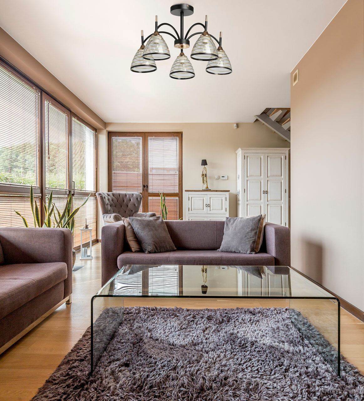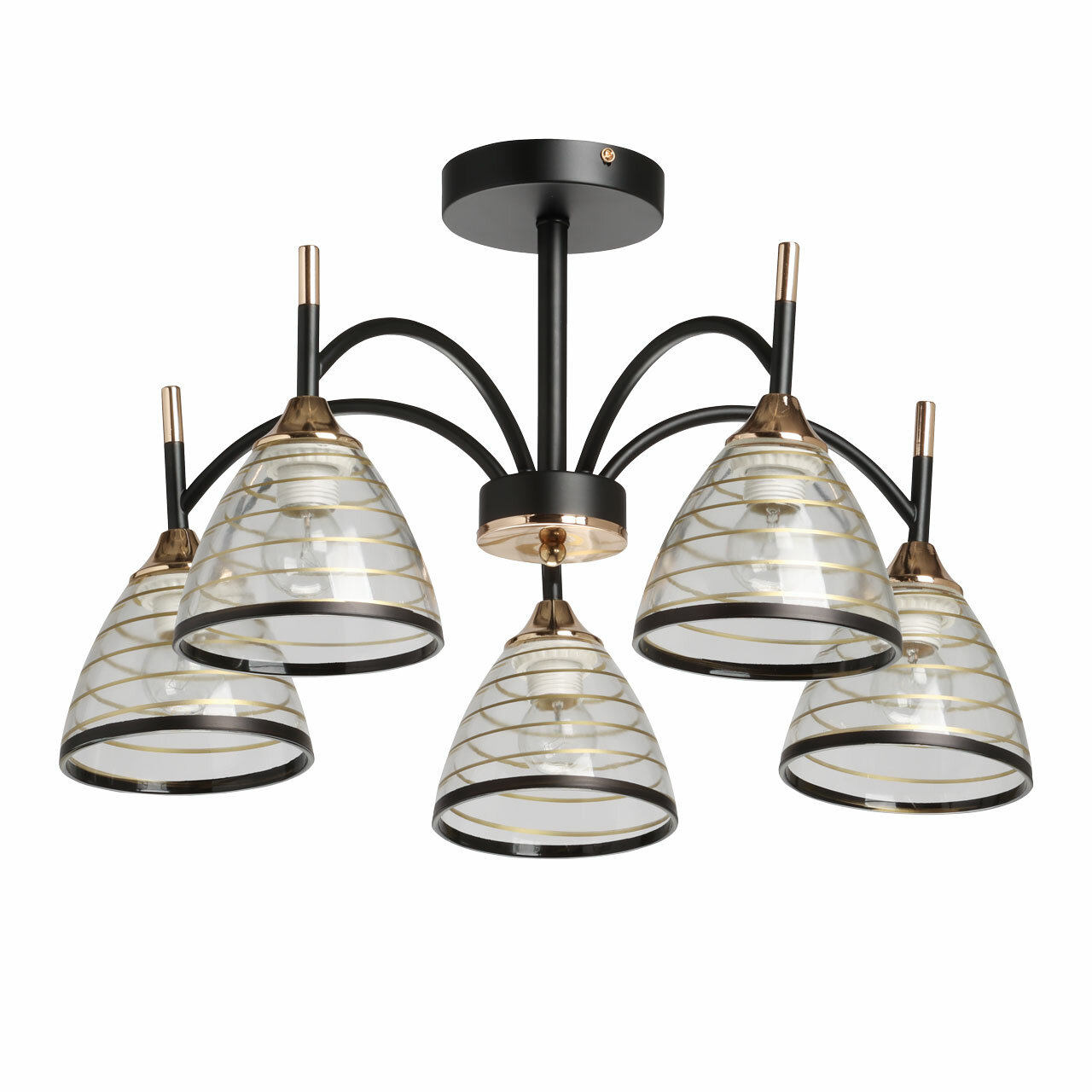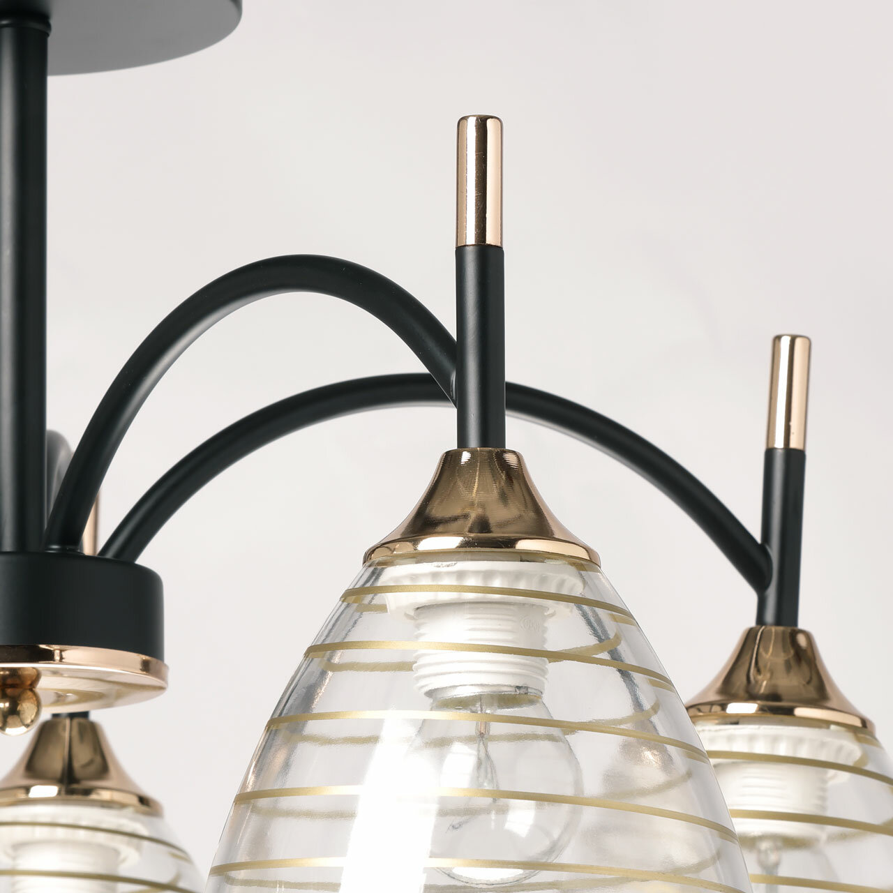 Люстра выполнена в черном цвете с элементами золотистого оттенка, что придает ей особый шик и элегантность. Основание люстры изготовлено из металла, окрашенного в черный цвет, а отдельные элементы основания гальванизированы в цвет золота. Прозрачные стеклянные плафоны с линейным рисунком и золотистыми и черными полосками придают люстре изысканный вид.