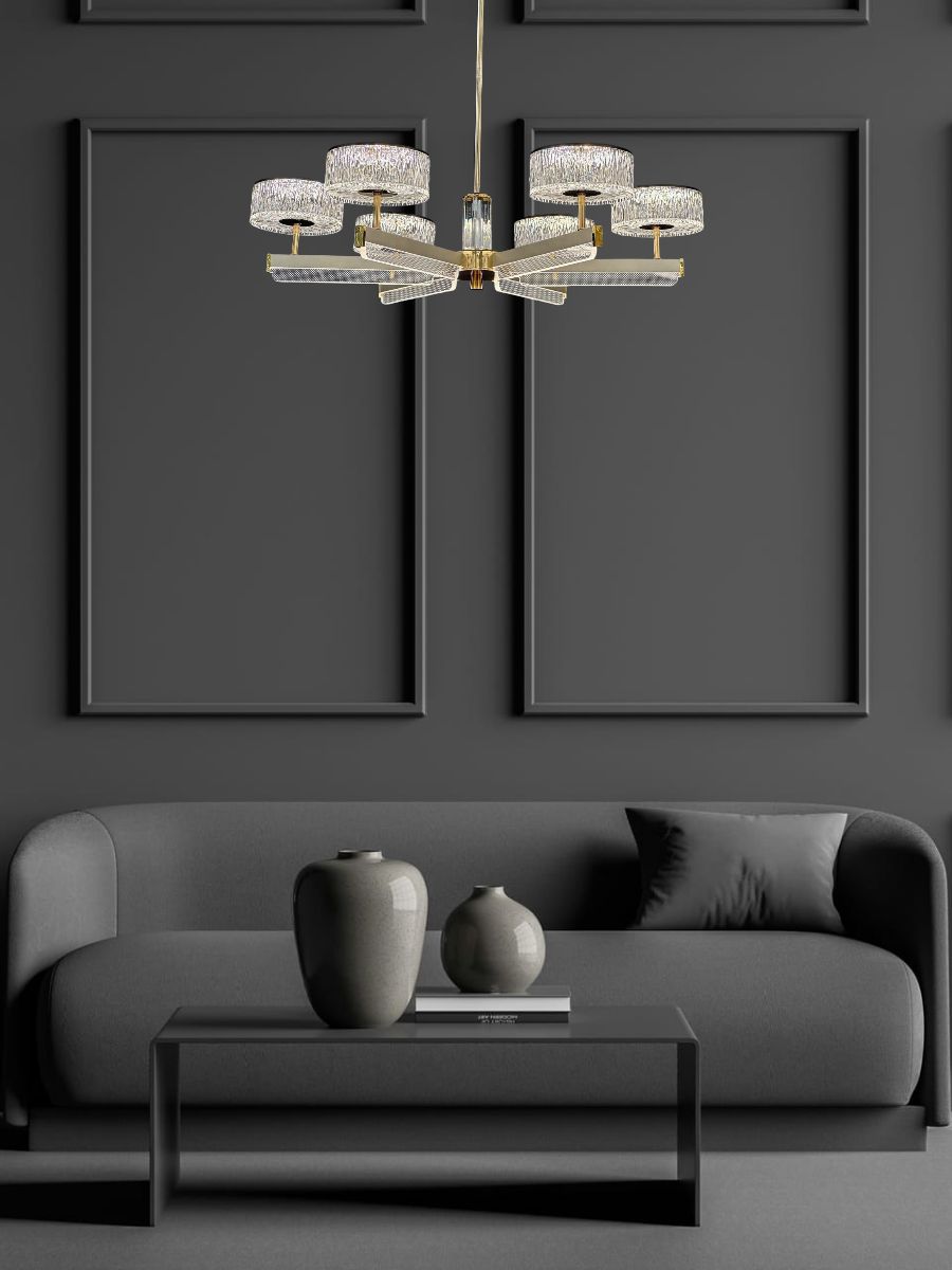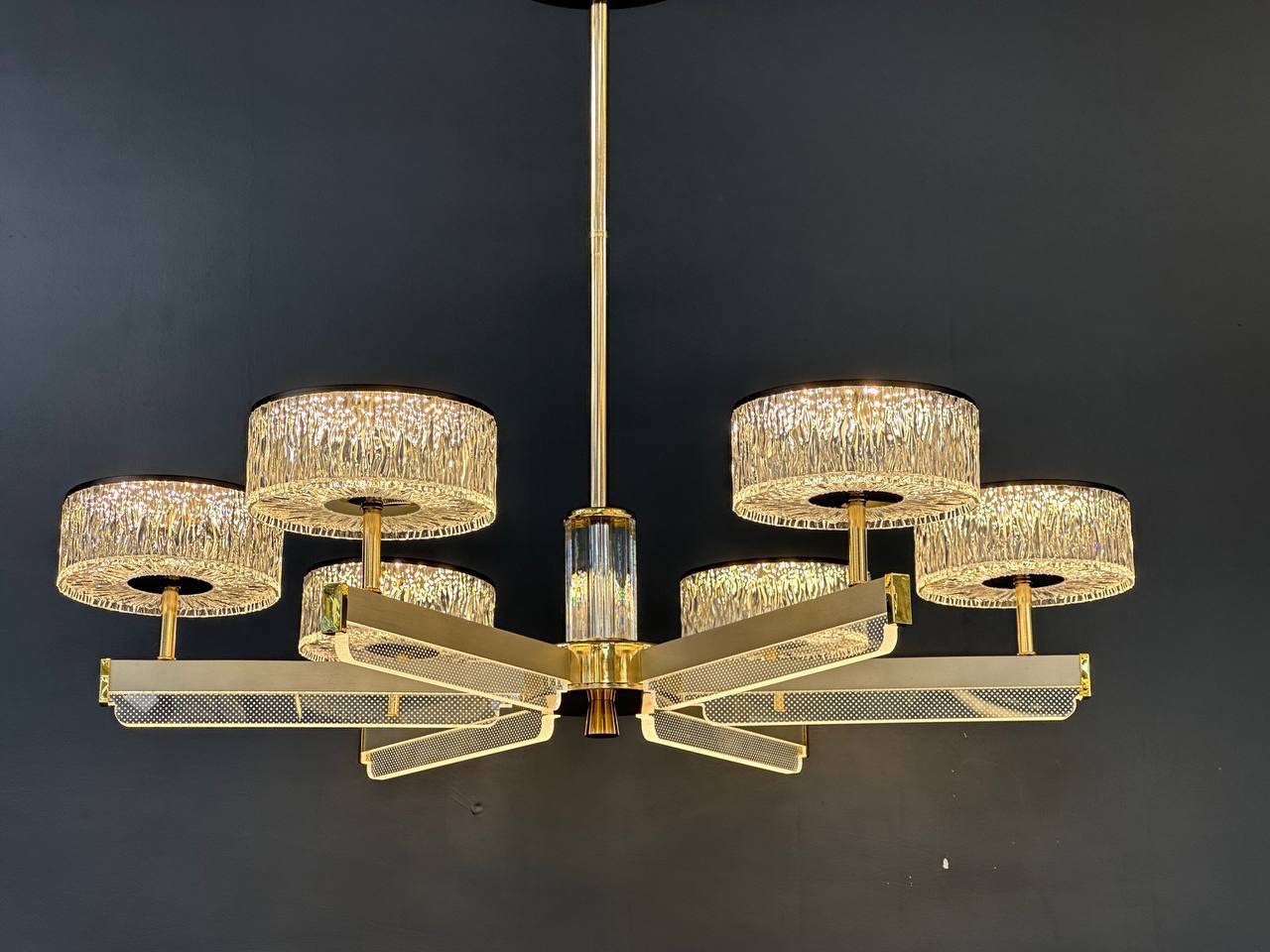 Люстра выполнена в золотом цвете, что придает ей роскошный и элегантный вид. Плафон изготовлен из акрила, что обеспечивает его долговечность и прозрачность.