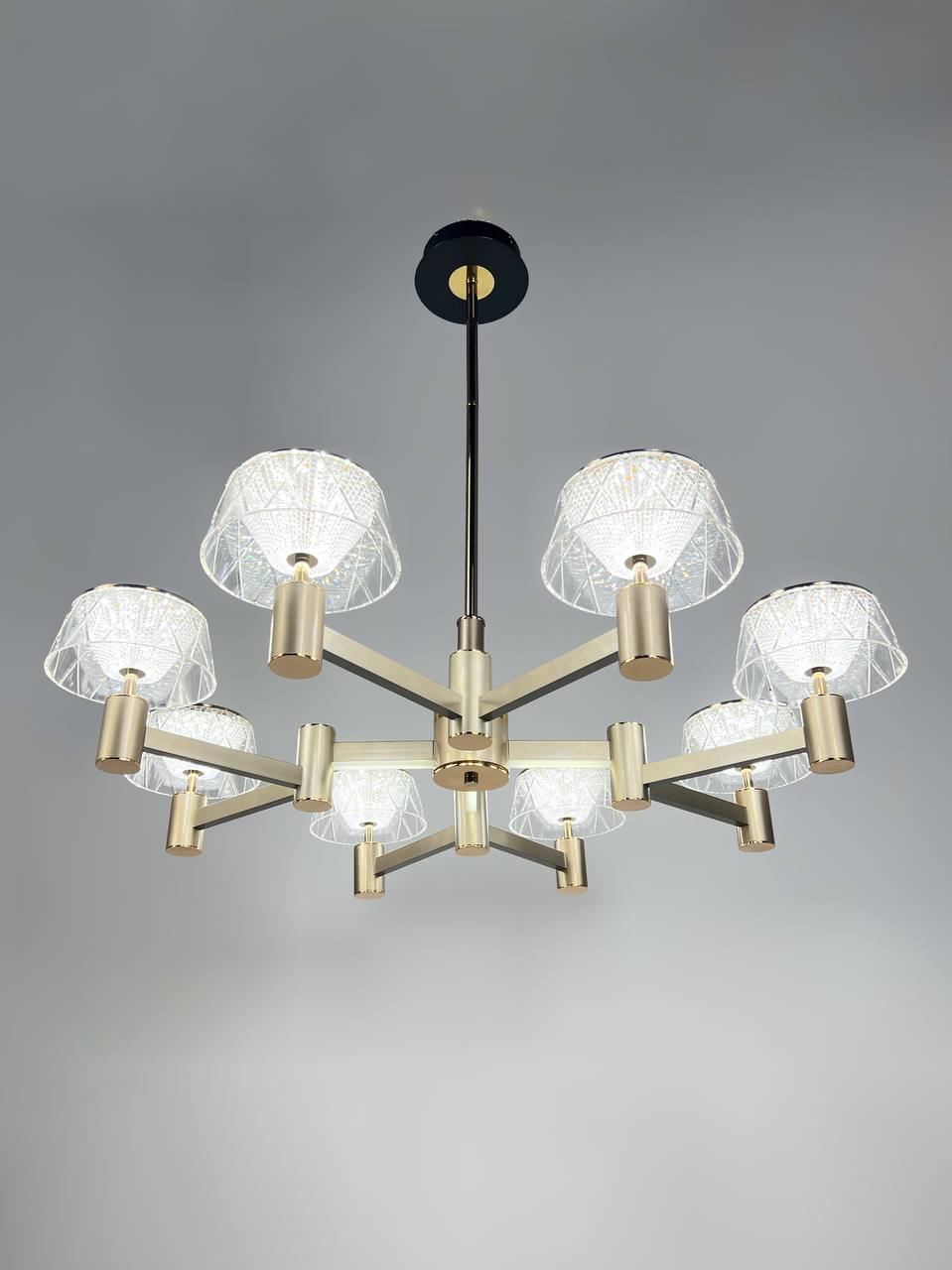Люстра оснащена 8 светодиодными лампами общей мощностью 64 Вт, что обеспечивает яркое и равномерное освещение на площади до 25 кв. м. Управление осуществляется механическим способом, что делает использование люстры простым и удобным.
