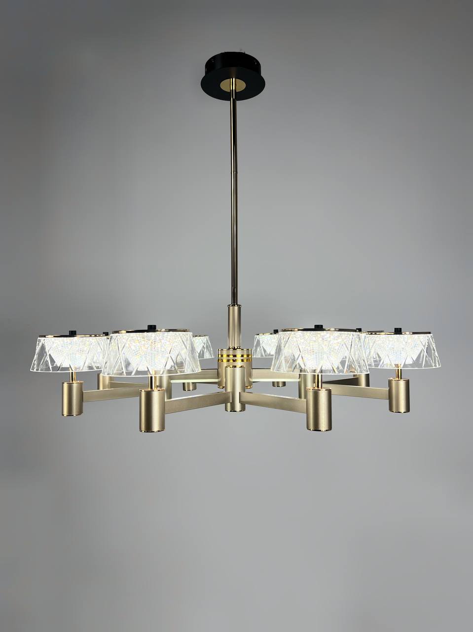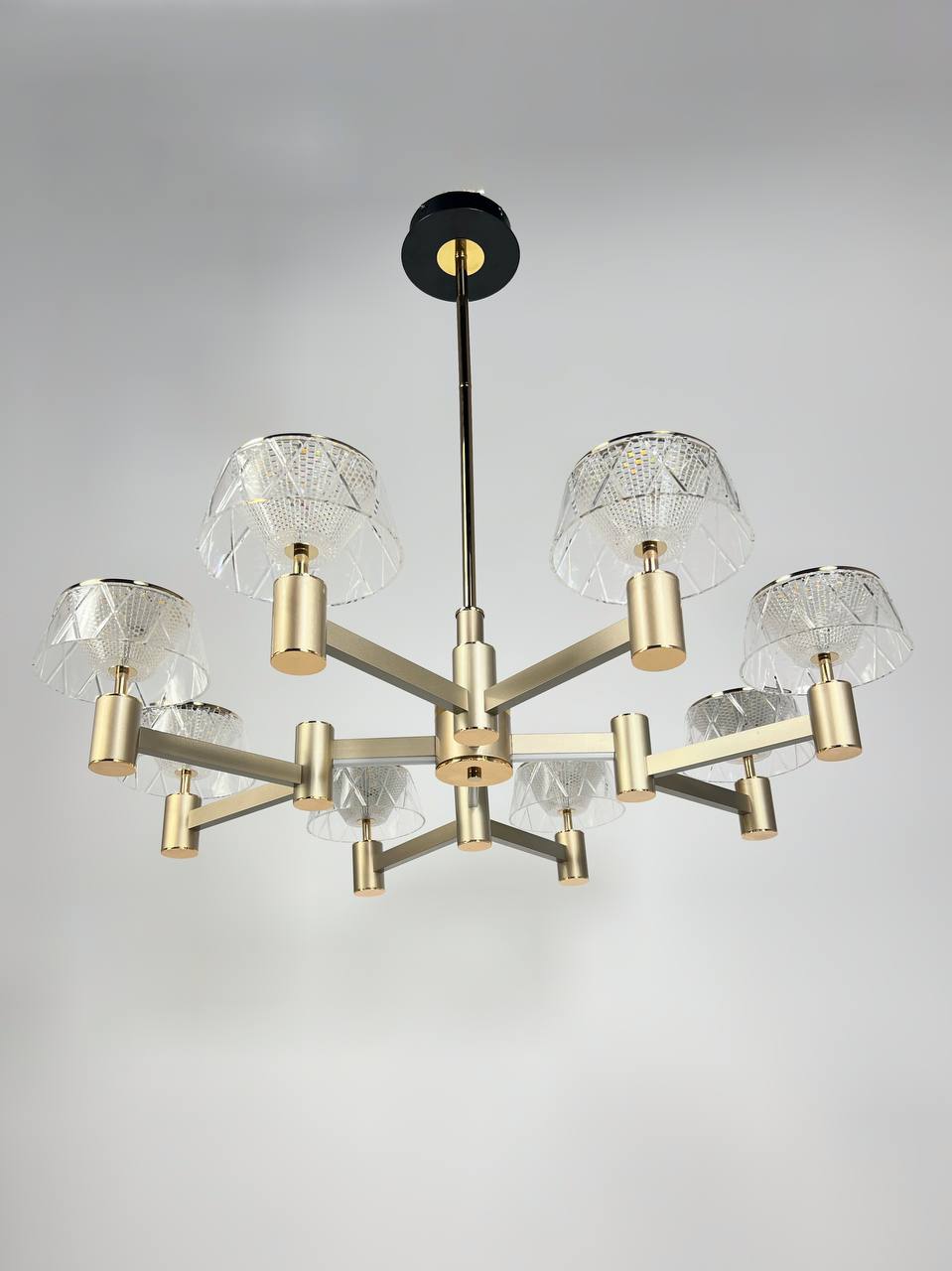 Люстра выполнена в золотом цвете, что придает ей изысканный и роскошный вид. Форма плафона - круг, что создает равномерное и мягкое освещение.