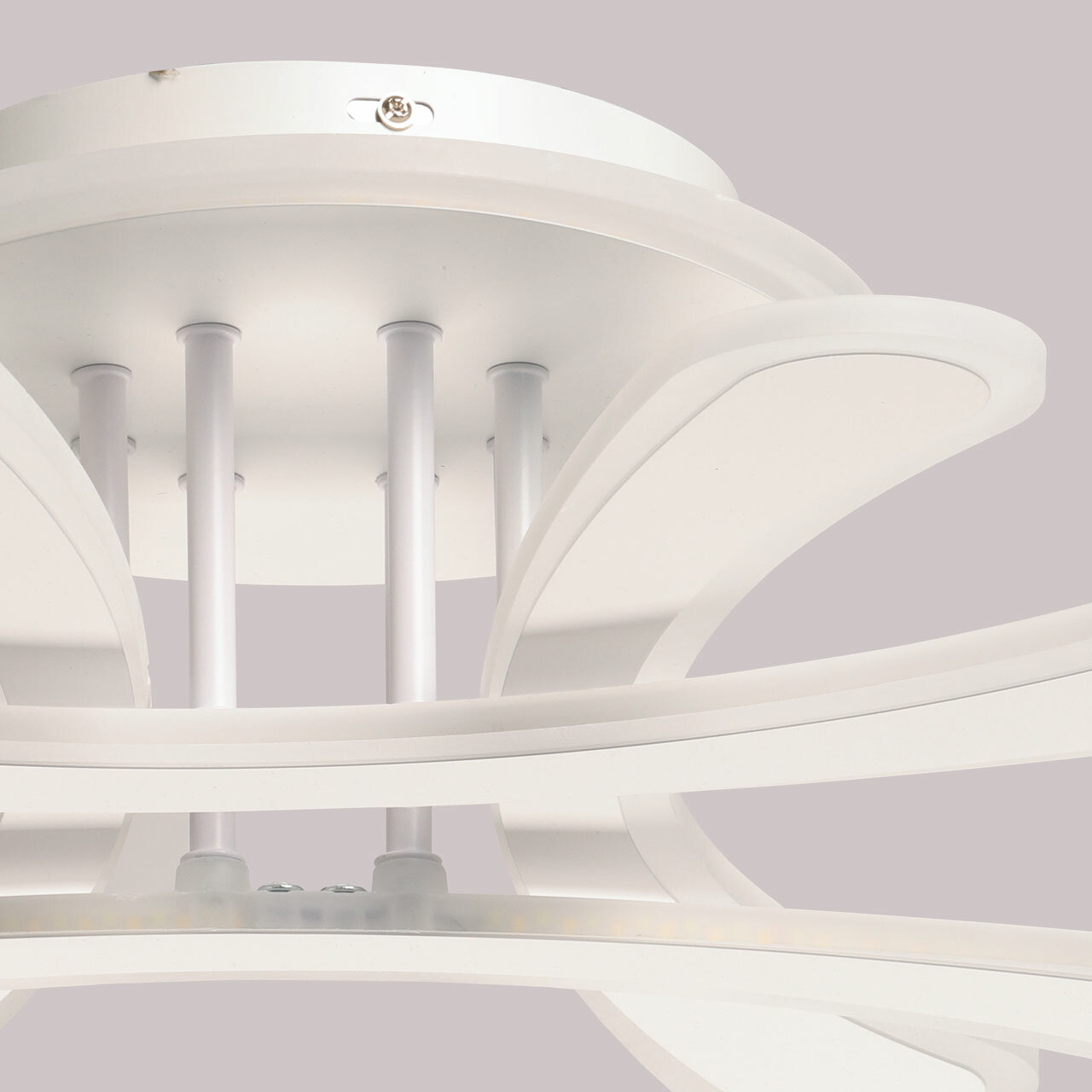 Металлическое основание люстры окрашено в белый цвет, а корпус плафонов выполнен из сплава алюминия с цинком и окрашен в тот же цвет. Светодиодные источники света закрыты матовым акрилом.