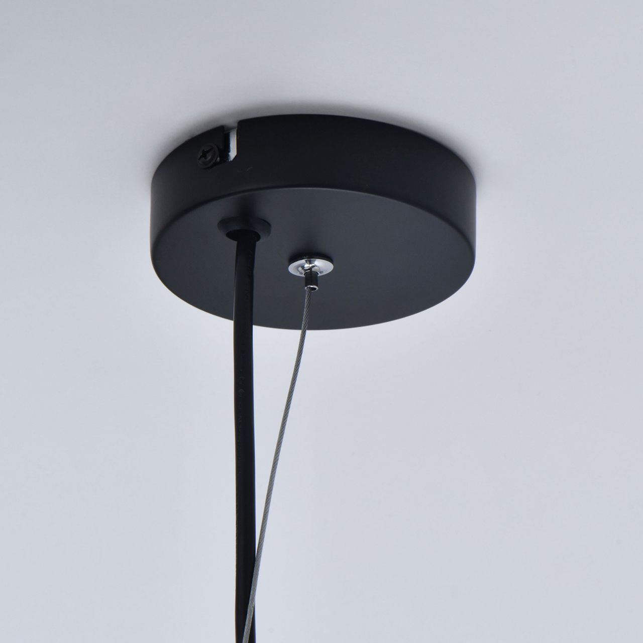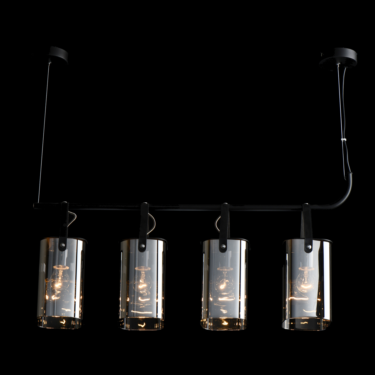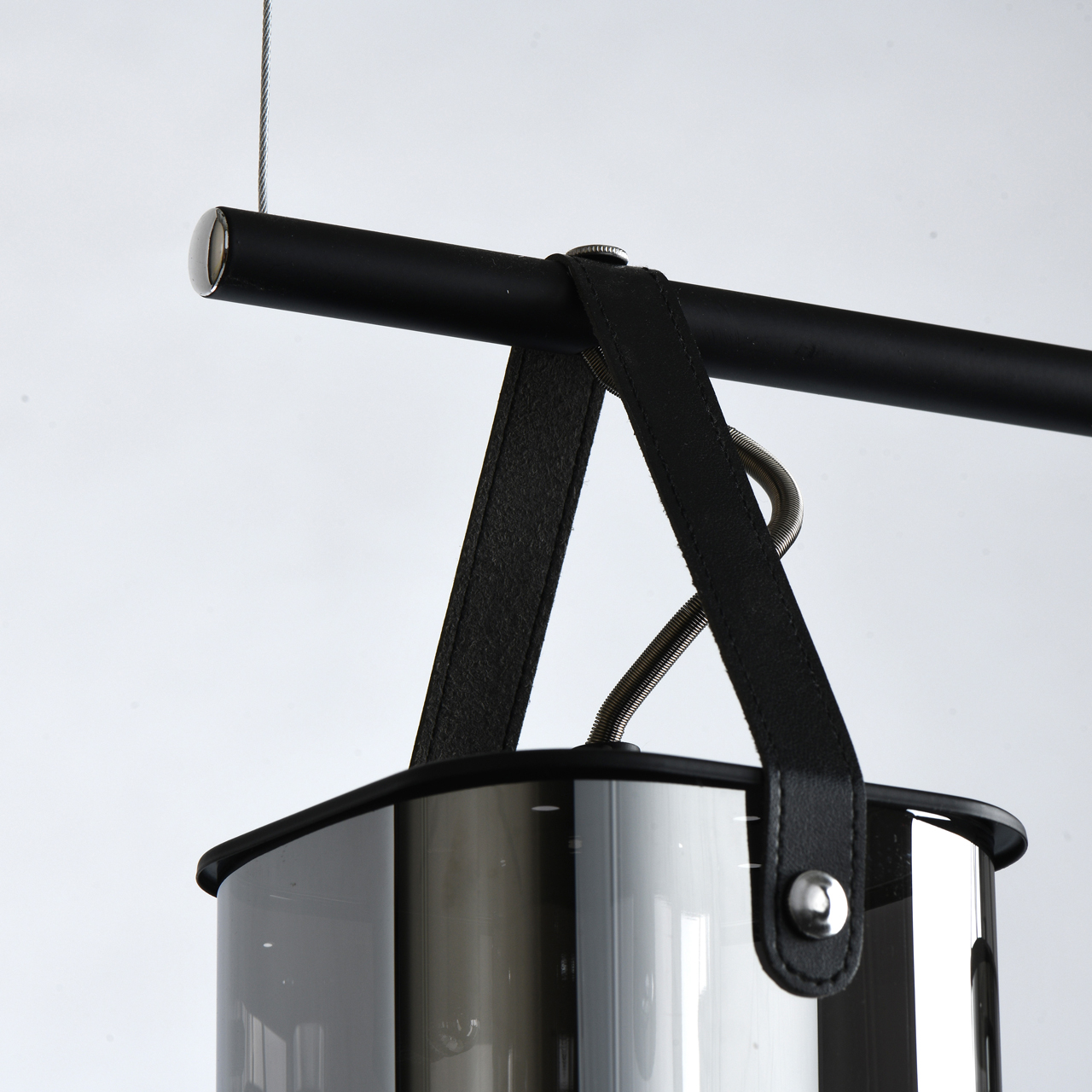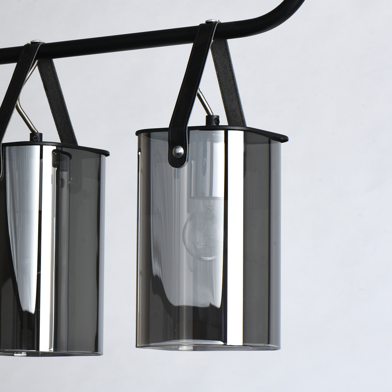 Основание светильника выполнено из металла и окрашено в черный цвет, что придает ему современный и стильный вид. Стеклянные плафоны гальванизированы в цвет антрацита, что добавляет изысканности и элегантности. Плафоны крепятся к основанию на кожаных ремешках черного цвета, что обеспечивает надежность и долговечность конструкции.